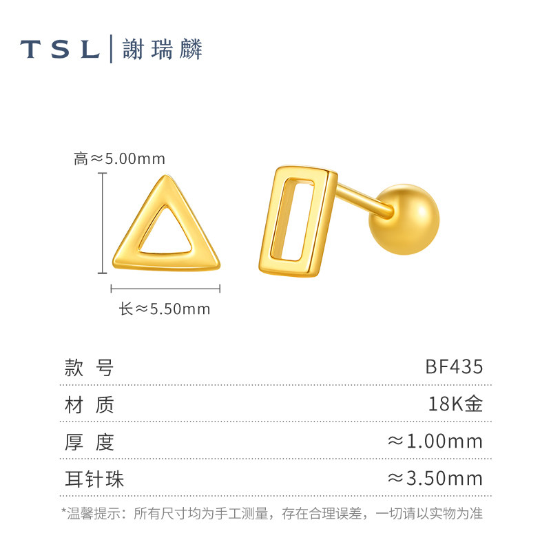 天猫TSL谢瑞麟18K金耳钉几何图形耳环K黄素金耳饰新品女士BF435