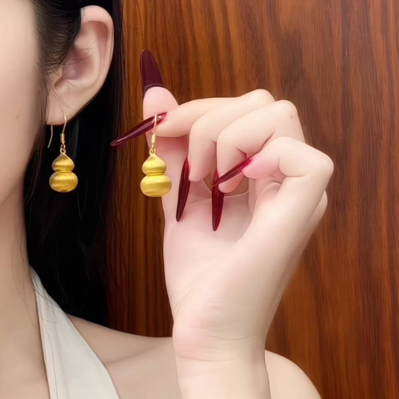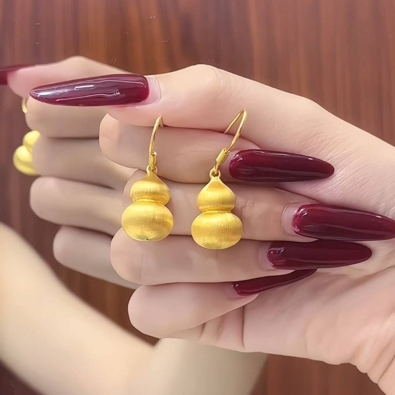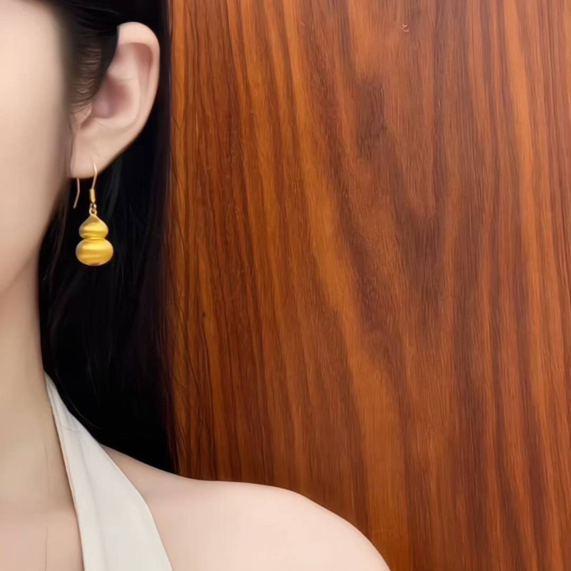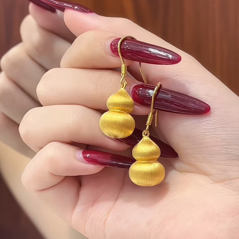 淘宝5D硬金黄金拉丝葫芦耳环女999足金弯钩福禄纯金正品耳饰送礼新款