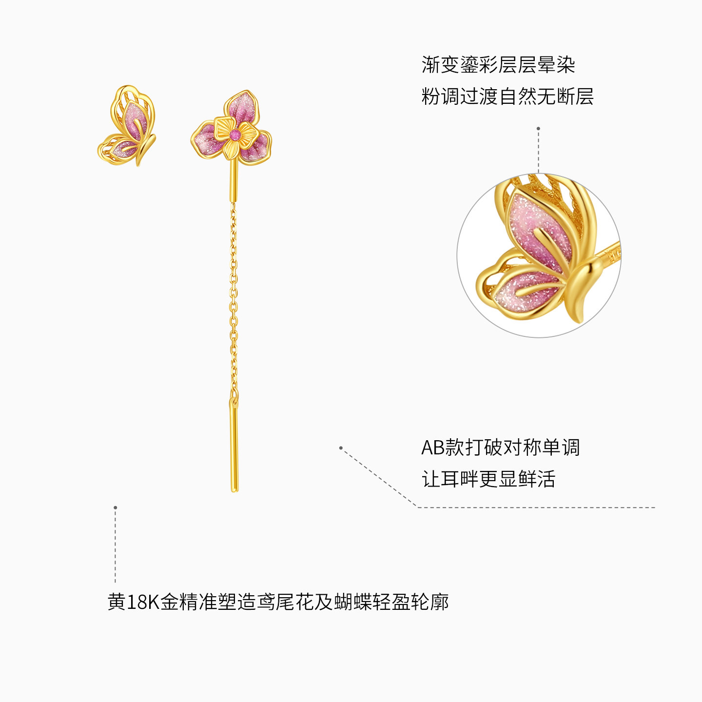 天猫潮宏基花韵黄18K金耳饰彩金耳线耳坠蝴蝶鸢尾花鎏彩生日礼物女