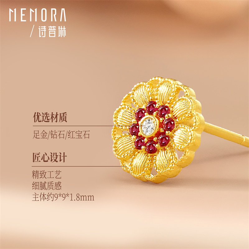 天猫【黄金镶钻】诗普琳 足金黄金古法红宝石耳钉 耳饰送女友礼物