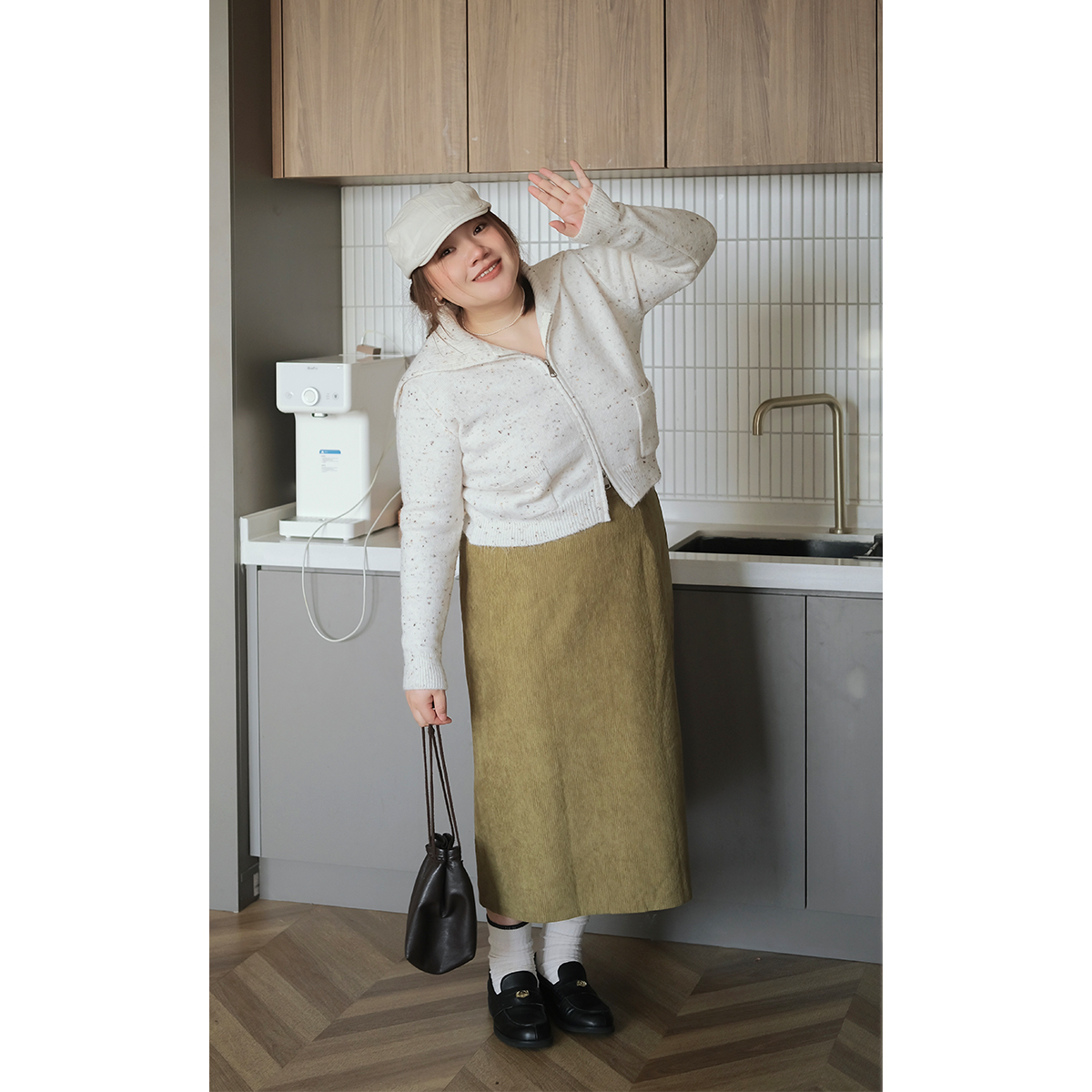 淘大码A字版型口袋纽扣松紧腰垂感中长款显瘦百搭羊毛针织半身裙