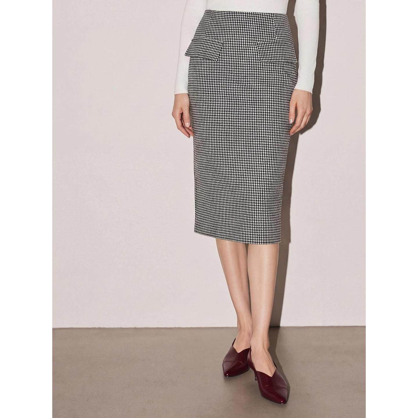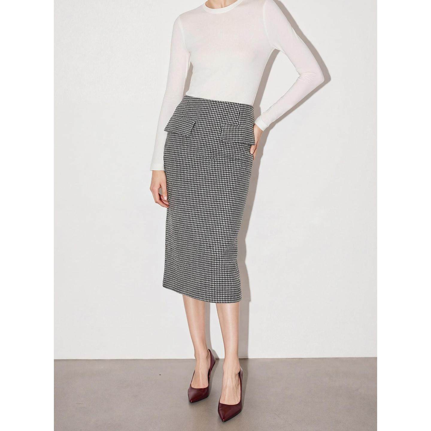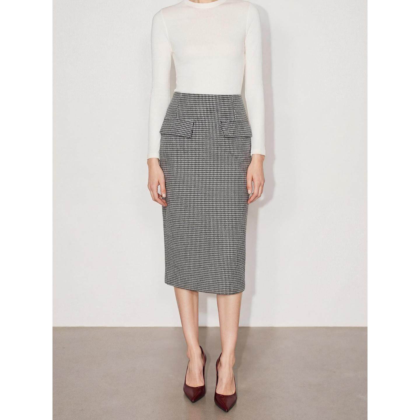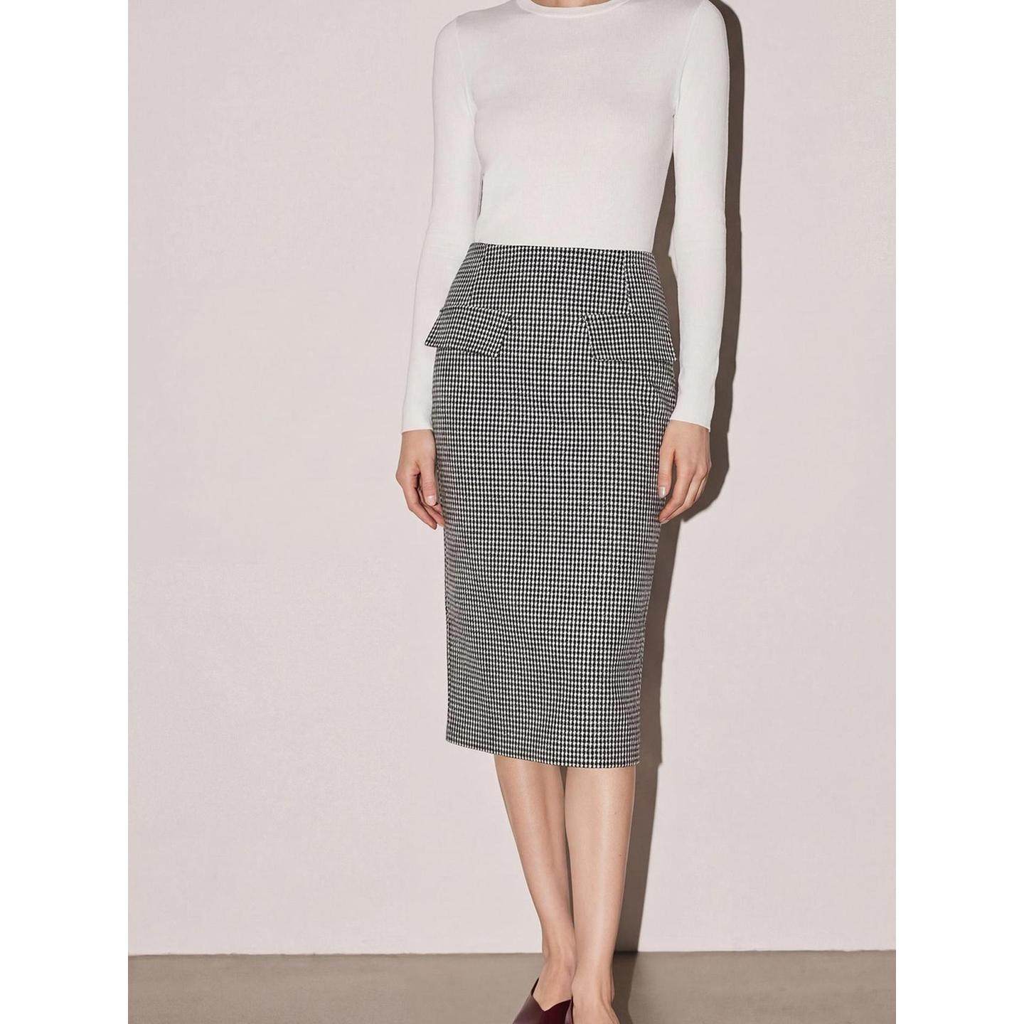BasicHouse/百家好2026春季新款千鸟格羊毛半身裙,以经典复古的千鸟格纹为设计亮点,融合现代剪裁工艺,打造优雅包臀一步裙版型。精选优质羊毛混纺面料,柔软亲肤且富有垂坠感,兼具保暖性与透气性,适合早春微凉时节。高腰设计拉长腿部线条,贴合身形却不紧绷,展现女性曼妙曲线。侧边隐形拉链与精致走线彰显品质细节,搭配西装、针织衫或衬衫皆宜,轻松驾驭职场通勤与日常休闲场景。百搭黑灰格纹色调,经典不过时,是打造知性优雅风格的必备单品。