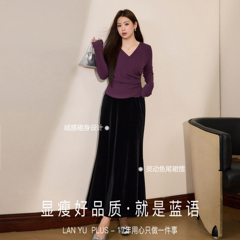 天猫蓝语大码女装胖mm气质优雅黑色丝绒半身裙2026春季高腰显瘦鱼尾裙