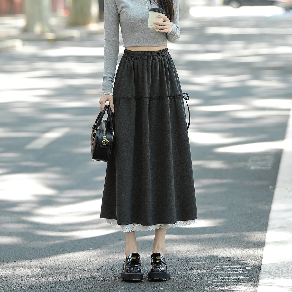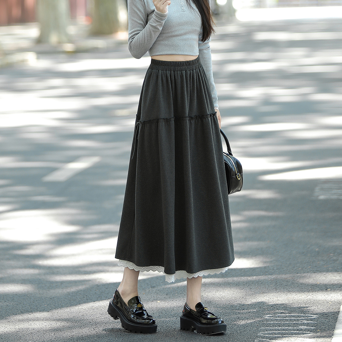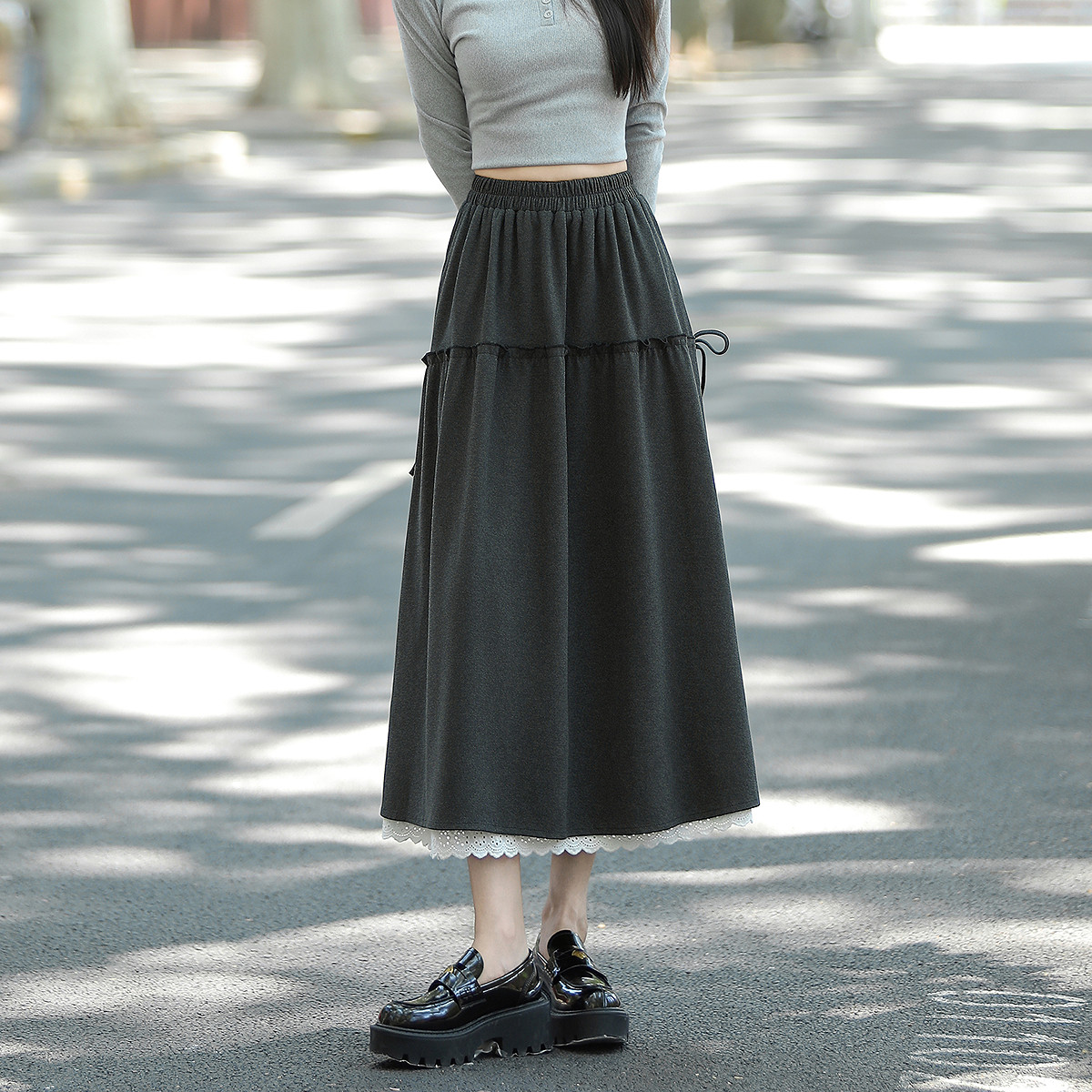 天猫唐狮2026半身裙女秋冬高级感女甜美温柔风褶皱蕾丝花边半身长裙