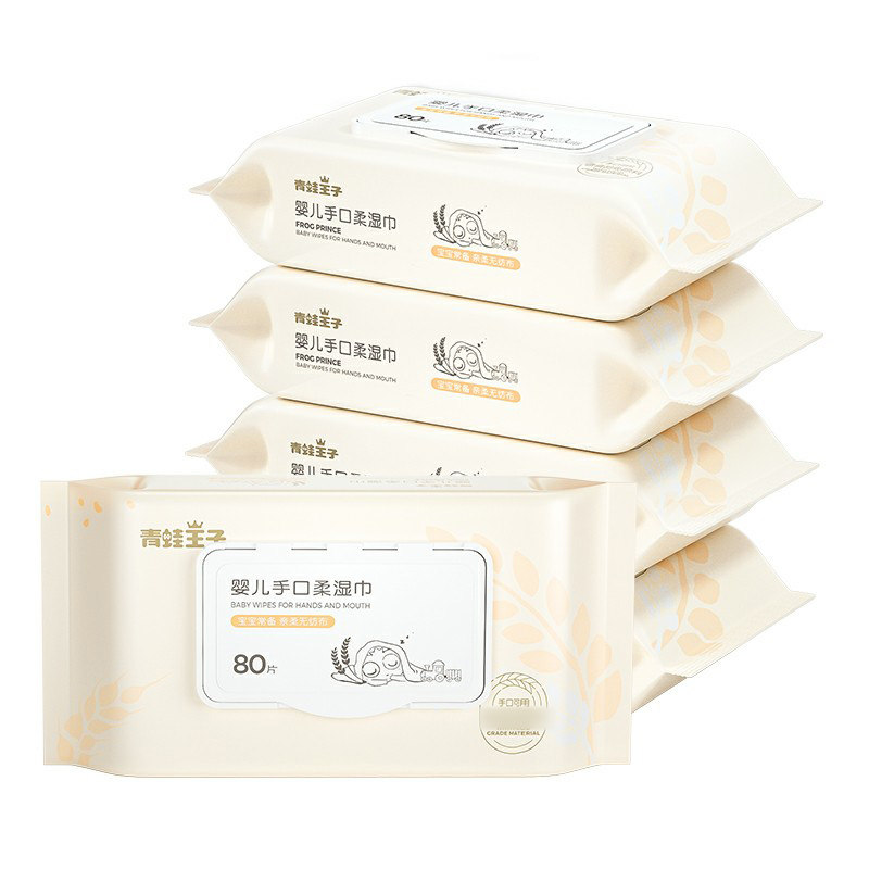 新包装青蛙王子婴儿手口柔湿巾,专为新生宝宝及婴幼儿娇嫩肌肤设计,每包含80片,共5包,配备便捷掀盖,密封防潮,随取随用更卫生。采用EDI超纯水与优质棉柔无纺布,无酒精、无香精、无荧光剂,温和亲肤,呵护宝宝敏感肌肤。特别添加芦荟精华与维生素E,清洁同时滋润保湿,适合手口、脸部及日常护理。加厚加大设计,一张多用,不易破损。通过多项安全检测,品质安心,是妈妈信赖的育儿必备品。便携装设计,居家出行皆适用,让洁净与呵护时刻相伴。
