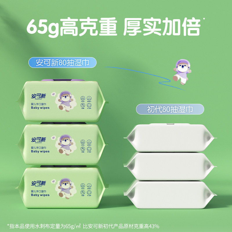 安可新婴儿湿巾专为0-3岁宝宝设计,采用优质无纺布与EDI纯水,温和无酒精、无香精、无荧光剂,通过皮肤刺激性测试,安全亲肤。特别适用于宝宝手、口、臀部等敏感部位清洁,柔韧厚实,擦拭不易破,有效呵护娇嫩肌肤。80抽大包装设计,抽数多、用量足,家庭日常护理或外出携带皆宜,性价比极高。密封盖+翻盖双重防护,有效锁水防干,持久保持湿巾湿润。安可新始终坚持品质为先,是万千妈妈信赖的婴儿护理品牌,让每一次清洁都安心、便捷、呵护备至。