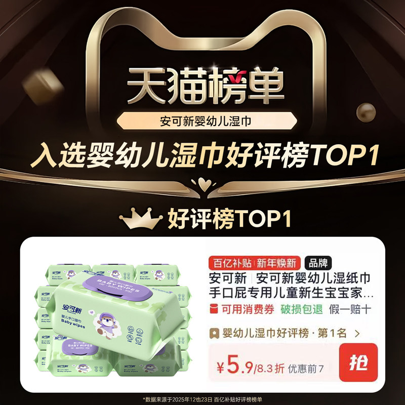 天猫安可新婴儿湿巾新生幼儿湿纸巾手口屁专用儿童宝宝实惠大包装80抽