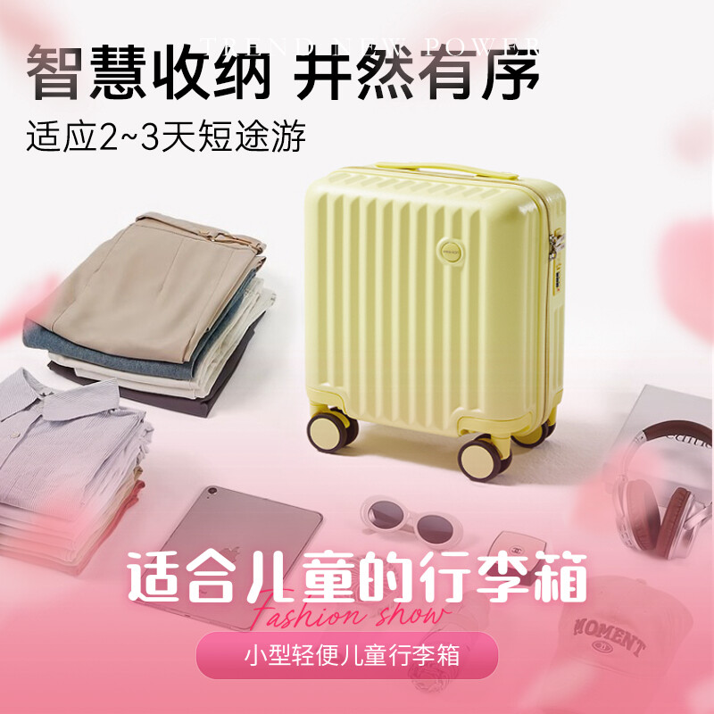 这款14寸小型儿童行李箱专为小朋友设计,尺寸为20×30×40厘米,符合春秋航空等主流航空公司随身登机标准,无需托运,出行更便捷。箱体采用轻盈耐用的ABS+PC材质,抗摔耐磨,有效保护内部物品。配备顺滑静音万向轮和可调高度拉杆,孩子推拉轻松省力。内部空间合理分区,设有收纳袋和弹性固定带,方便整理衣物玩具。可爱卡通图案设计,激发孩子独立出行兴趣。提手圆润防滑,细节安全贴心。无论是短途旅行、亲子出游还是幼儿园活动,这款小皮箱都是孩子的理想旅行伙伴,让出行更省心、更有趣。
