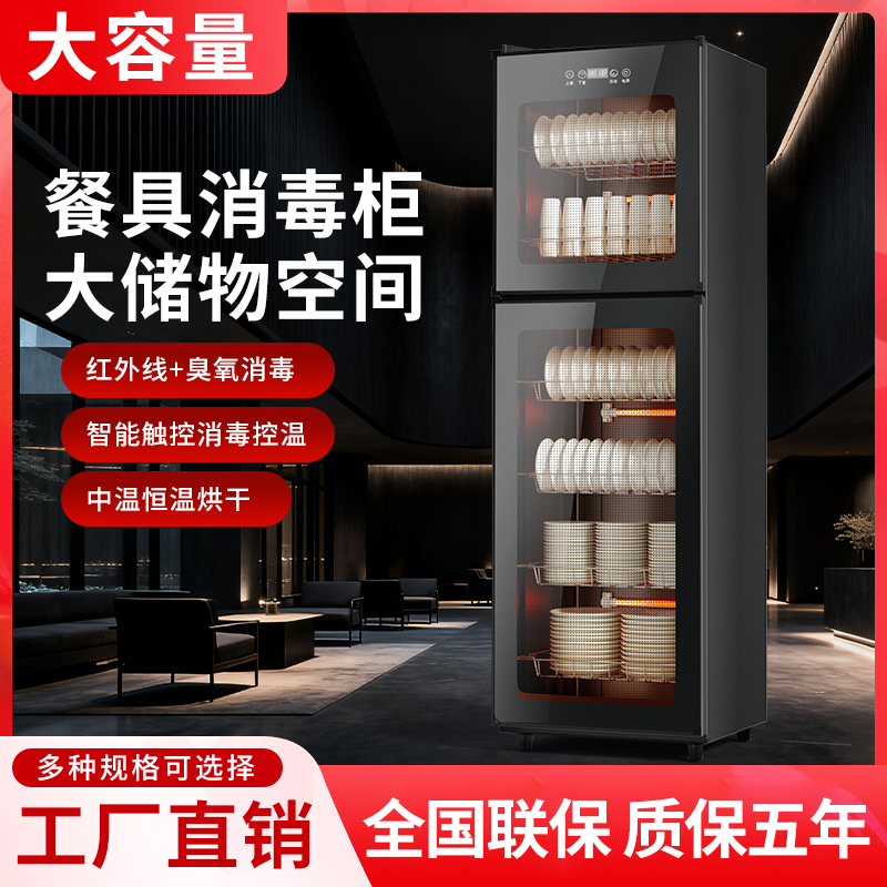这款家用商用两用大容量立式消毒柜,采用优质不锈钢材质,坚固耐用,防腐防锈,适用于家庭、饭店、餐厅及各类餐饮厨房。拥有超大容量设计,可轻松容纳大量餐具,满足高峰时段使用需求。配备高温、紫外线、臭氧三重消毒模式,杀菌率高达99.9%,有效保障餐具卫生安全。智能触控面板操作简便,支持定时、烘干、保洁等多功能设置,节能环保。立式结构节省空间,门体密封性好,防止二次污染。无论是日常家用还是商用餐饮,都能提供高效、可靠的餐具消毒解决方案,是守护饮食健康的重要厨房设备。