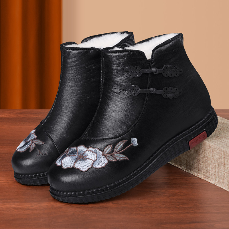 冬季妈妈棉鞋真皮羊毛中老年女鞋老人奶奶鞋加绒保暖软底防滑短靴