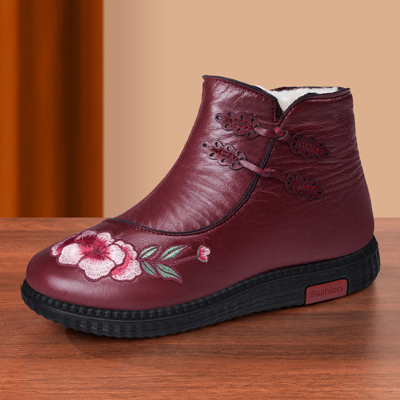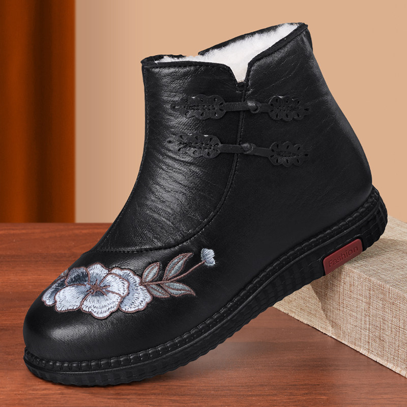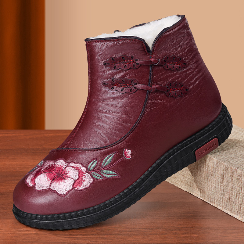 淘冬季妈妈棉鞋真皮羊毛中老年女鞋老人奶奶鞋加绒保暖软底防滑短靴