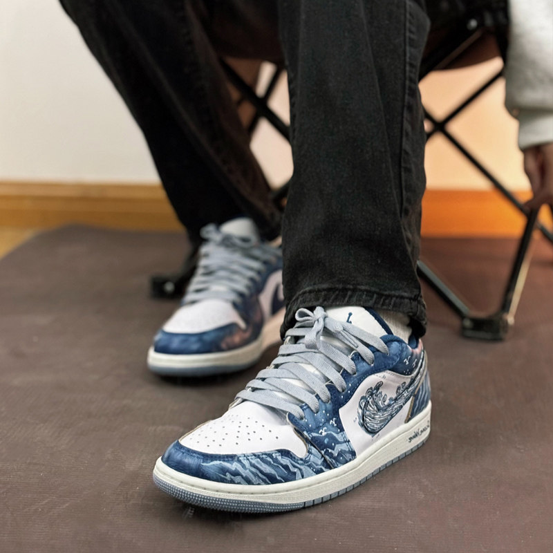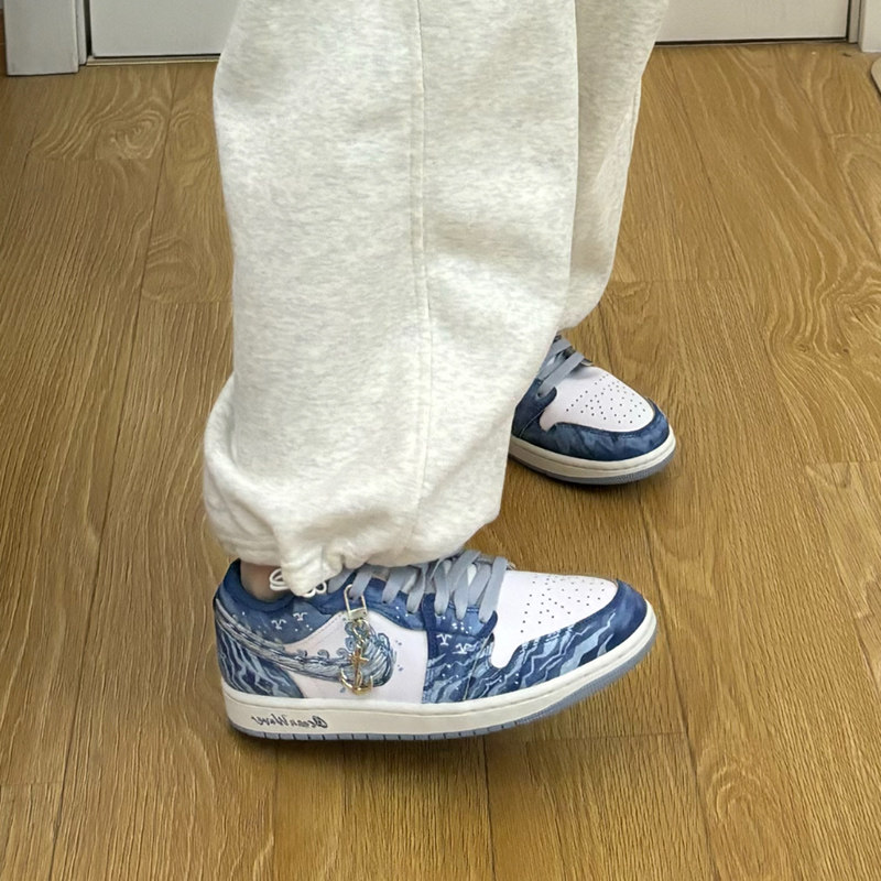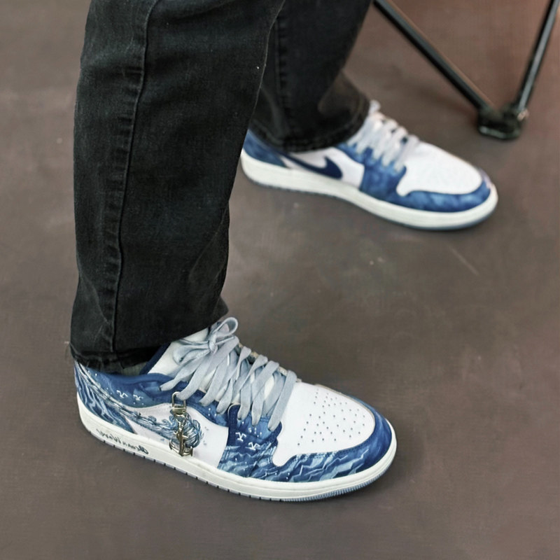 淘耐克球鞋定制Nike Air Jordan1海洋之蓝手绘涂鸦低帮篮球鞋
