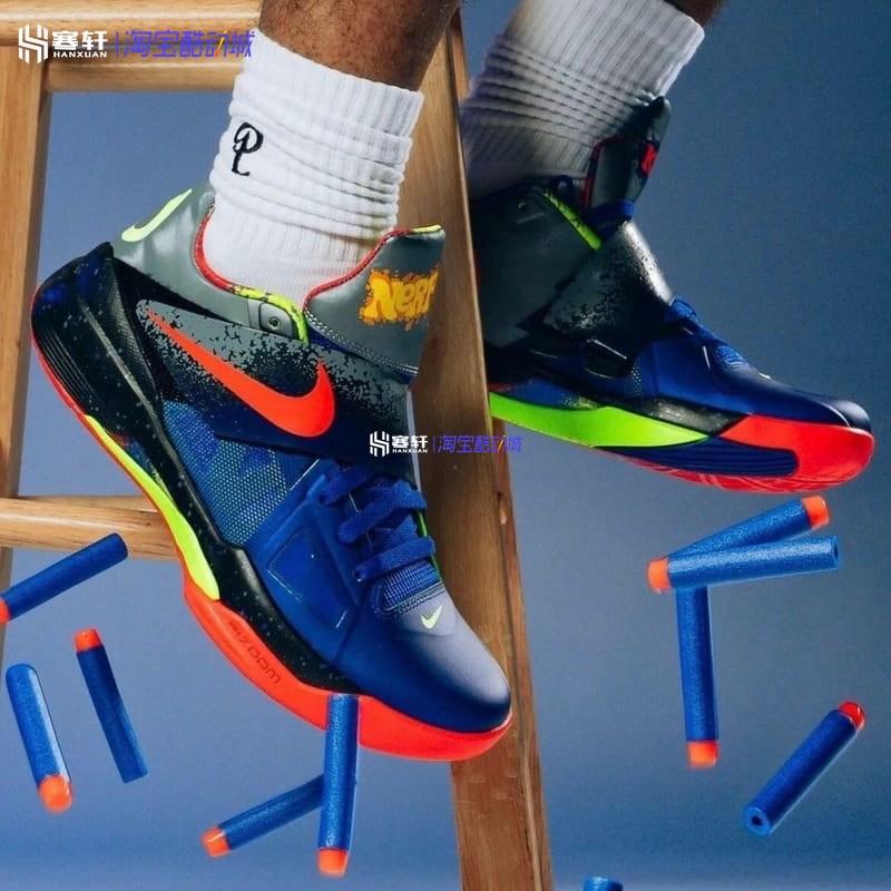 Nike KD4 NERF 联名款篮球鞋(型号:FQ8180-400)是耐克与孩之宝旗下NERF玩具品牌合作推出的特别版本,致敬凯文·杜兰特的第四代签名战靴。鞋身采用蓝红撞色设计,灵感源自NERF经典配色,充满活力与童趣。低帮造型兼顾灵活性与支撑性,适合实战与日常穿搭。鞋面融合轻质合成材料与透气网布,提升舒适感;中底搭载Zoom Air缓震科技,响应迅速,助力爆发力表现。细节处融入NERF标志性元素,如鞋舌标签与鞋底纹理,彰显联名特色。这款鞋不仅性能出众,更将运动与潮流巧妙融合,是篮球爱好者与收藏者的理想之选。
