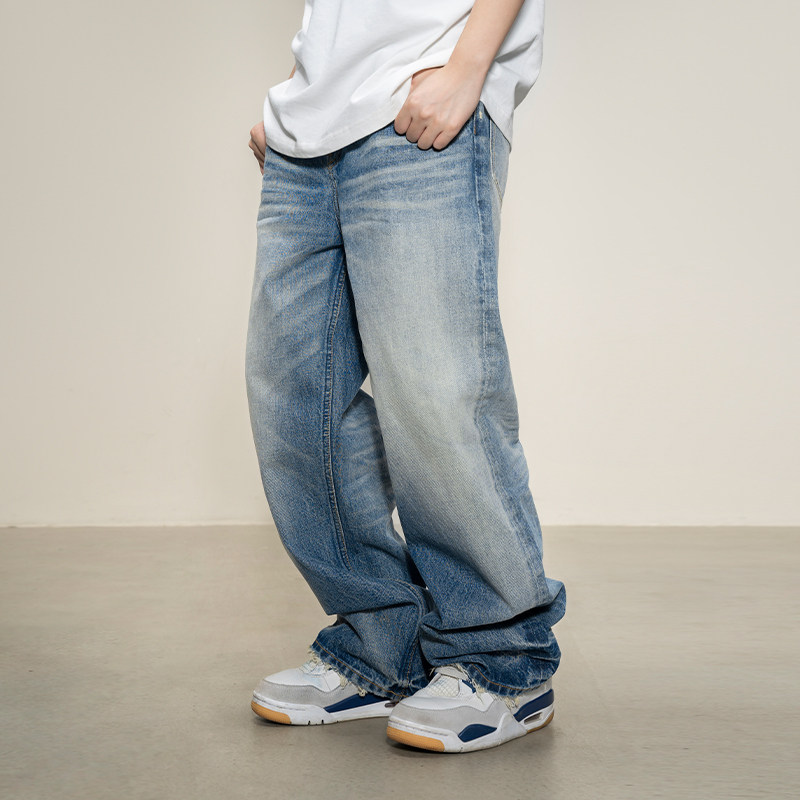 春秋季美式休闲痞帅复古怀旧浅蓝色牛仔裤男直筒宽松百搭阔腿裤子