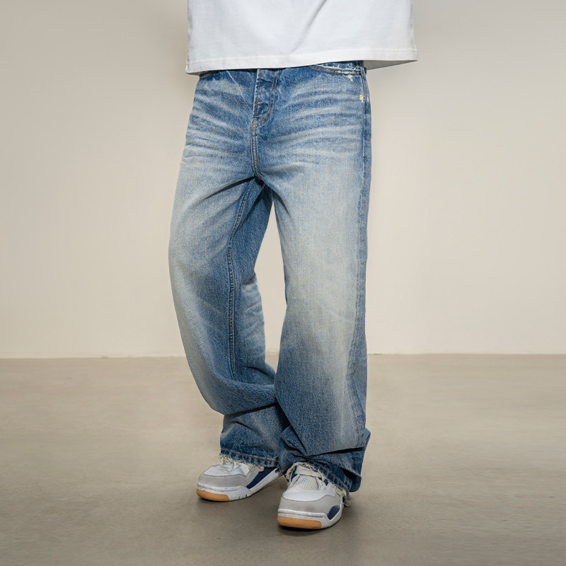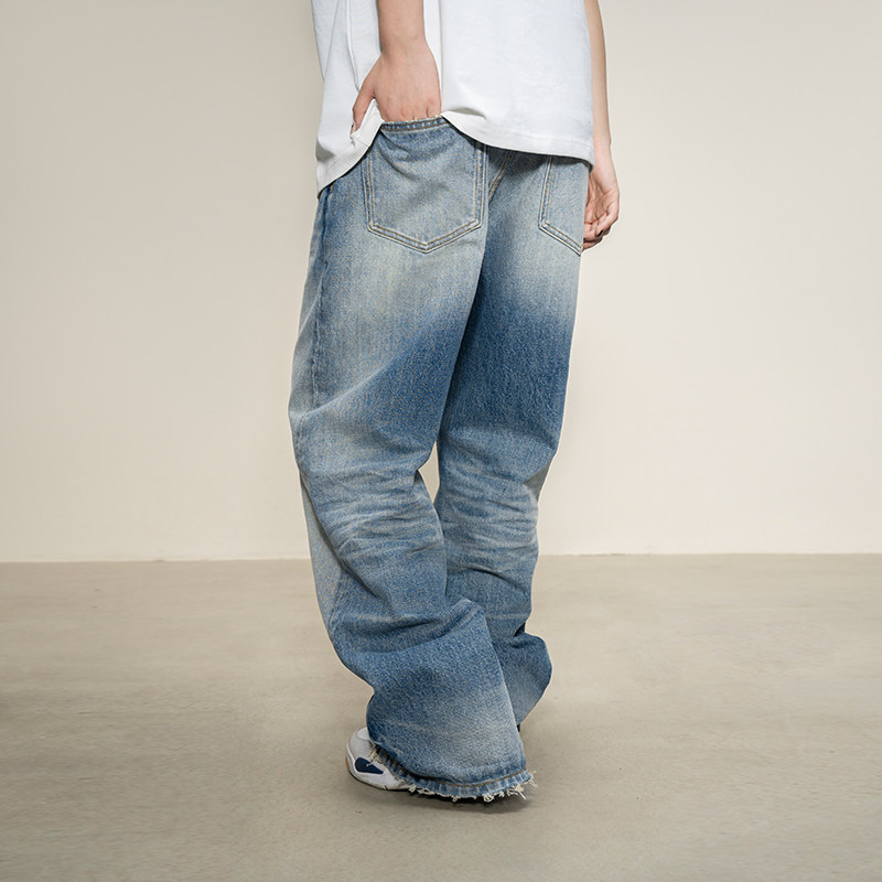 淘春秋季美式休闲痞帅复古怀旧浅蓝色牛仔裤男直筒宽松百搭阔腿裤子
