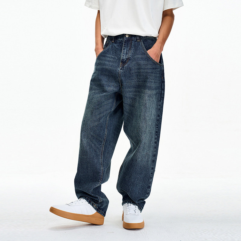 nick tian 宽松休闲牛仔裤男秋季港风复古百搭深蓝色阔腿直筒长裤
