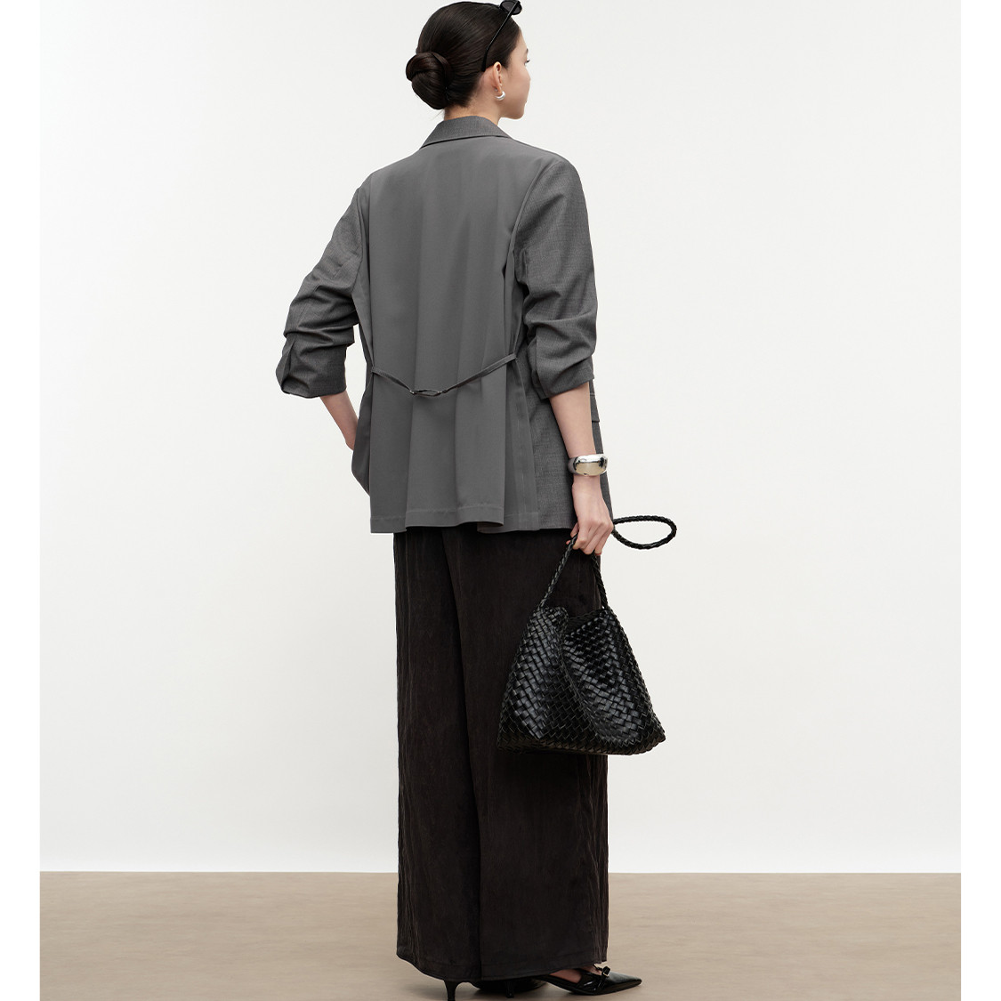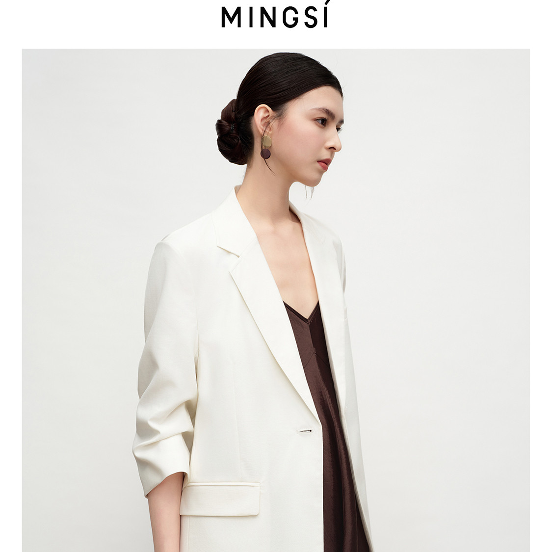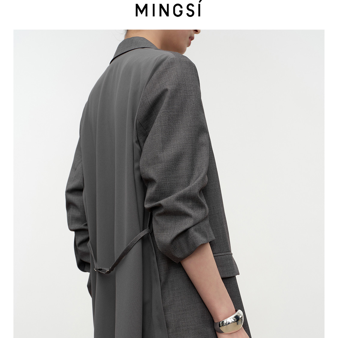 MINGSI女装2024夏季新款羊毛拼接设计款西装外套MC1020503,融合经典通勤风格与现代高智感美学。采用优质羊毛与透气面料拼接设计,兼顾挺括廓形与夏日舒适穿着体验。利落剪裁搭配微收腰设计,凸显女性干练气质,同时不失优雅线条。细节处融入精致金属扣饰与隐藏式口袋,实用且富有设计感。多场景适配,无论是职场会议还是都市出行,皆能展现从容自信的知性魅力。MC1020503以简约高级的色调与匠心工艺,诠释当代女性独立、睿智的时尚态度,是夏季衣橱中不可或缺的百搭单品。