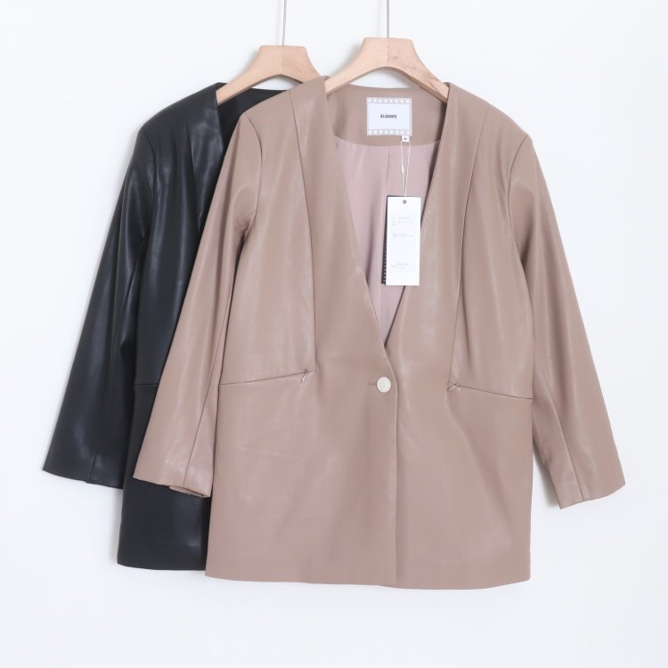 淘宝D07064日单新款1.76W客供料V领单粒扣微宽松女气质软PU皮西装外套