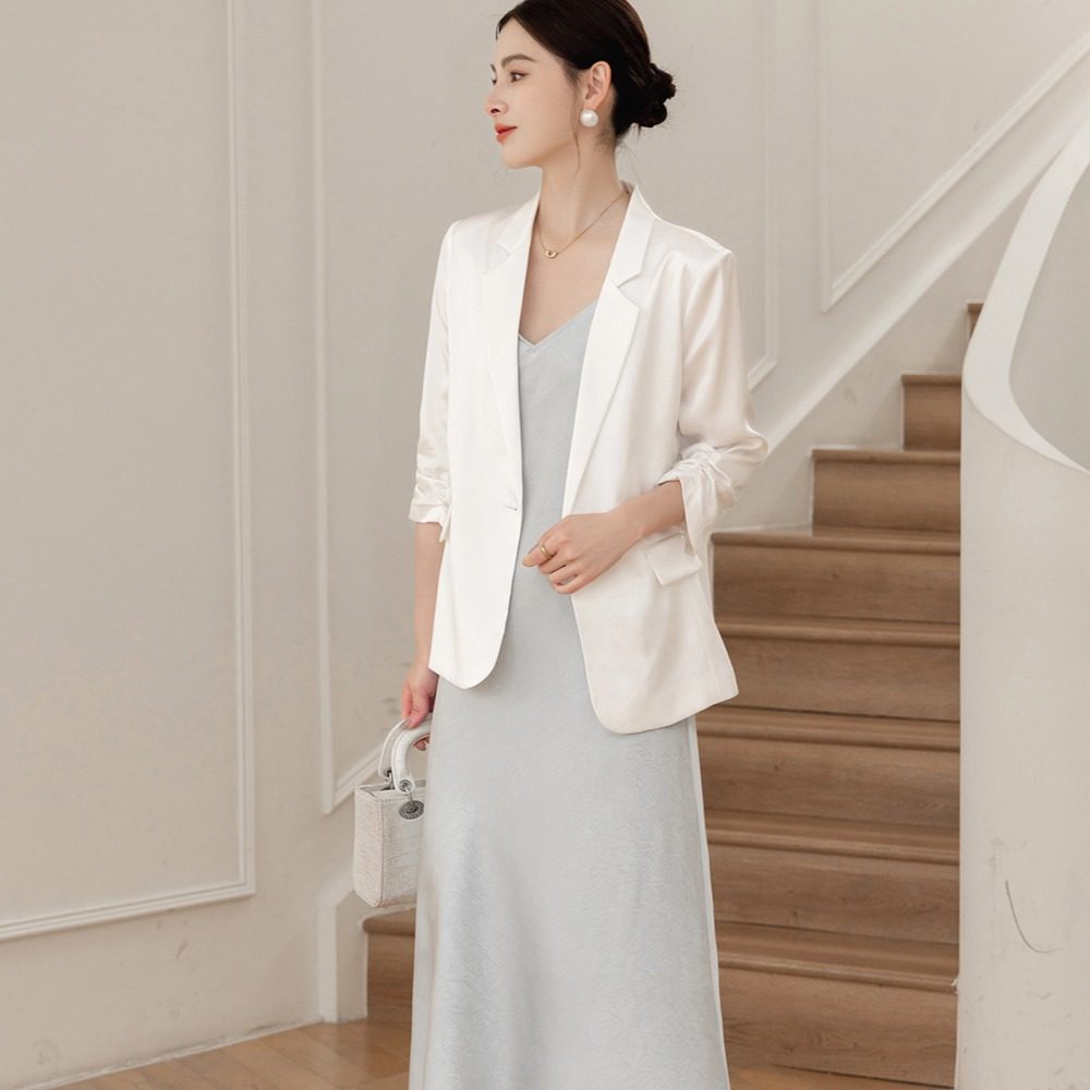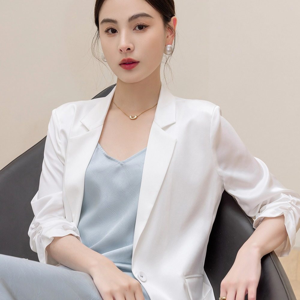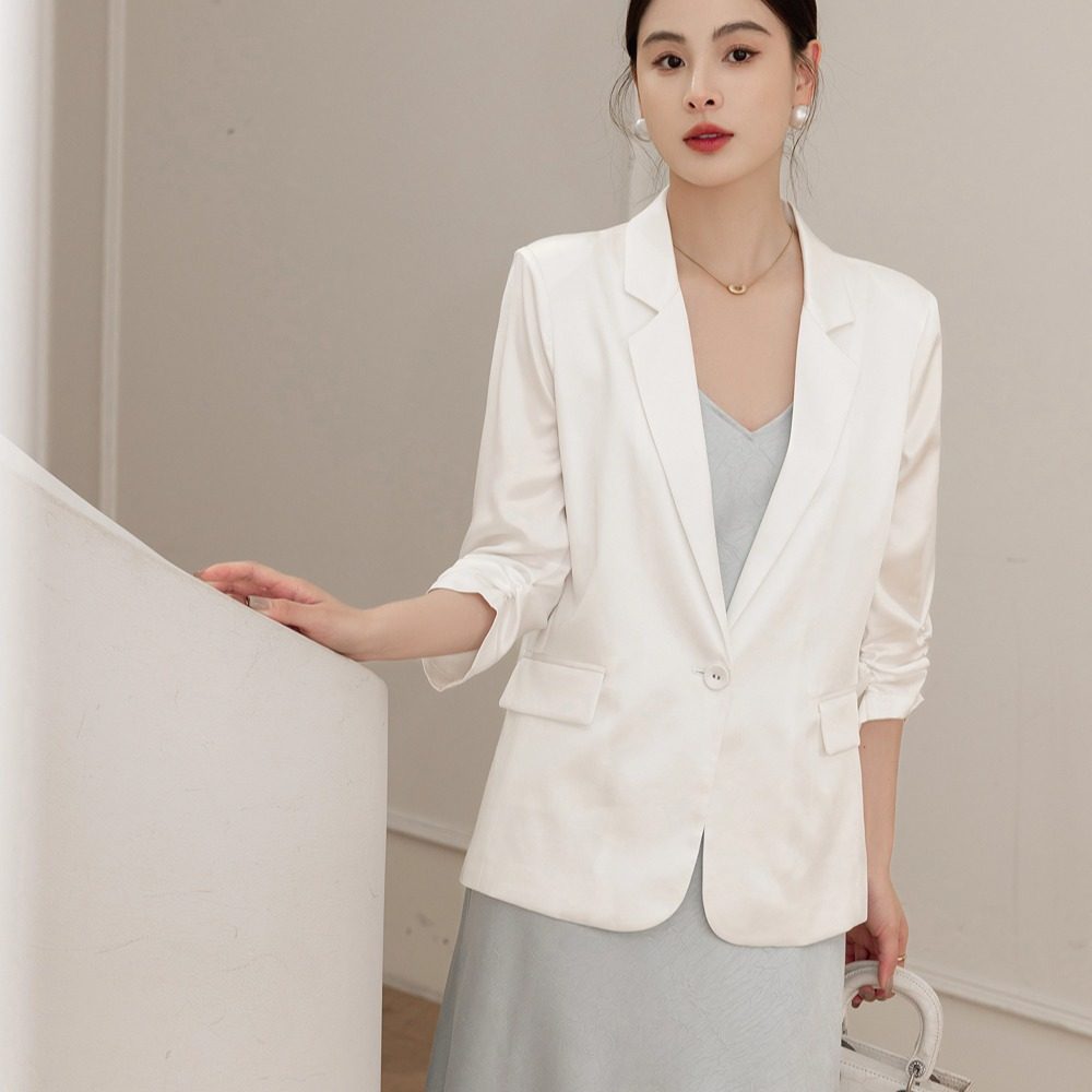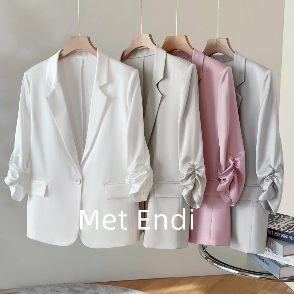 淘宝恩迪醋酸缎面七分袖西装外套2025年春夏高级感百搭纯色西服上衣女