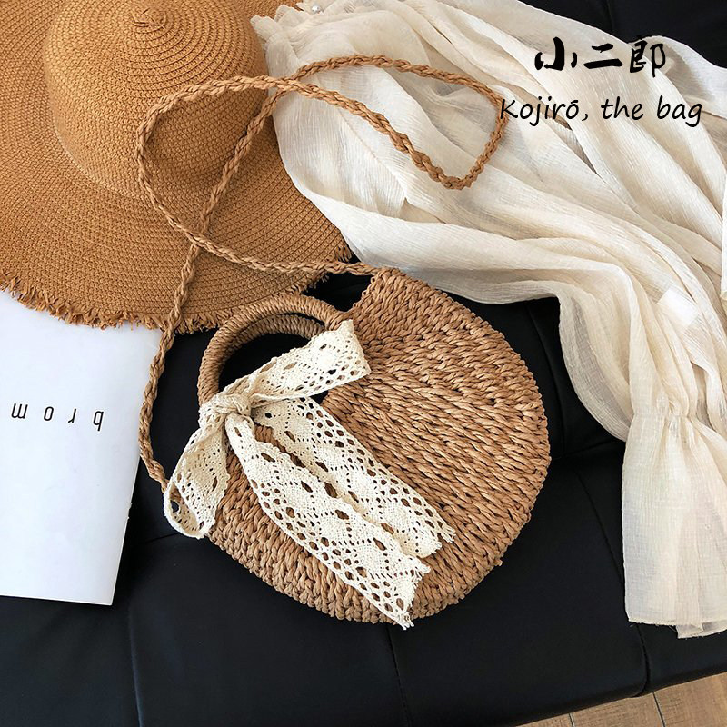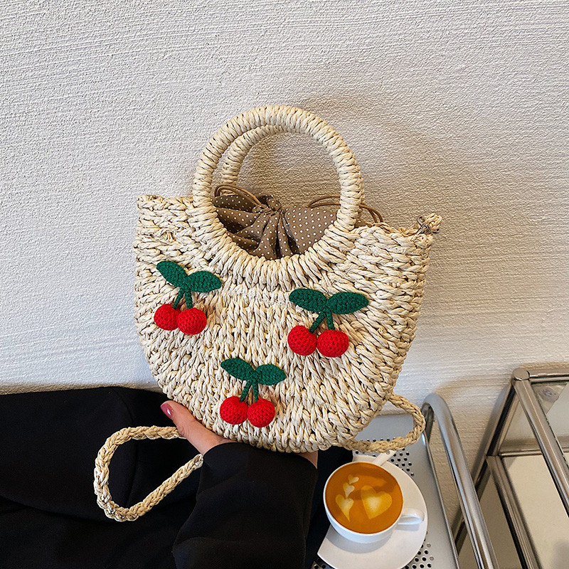 淘宝夏季时尚新款半圆形蝴蝶结樱桃手提斜挎草编包包女ins度假单肩包