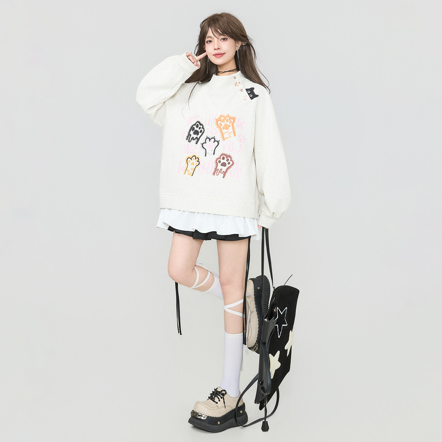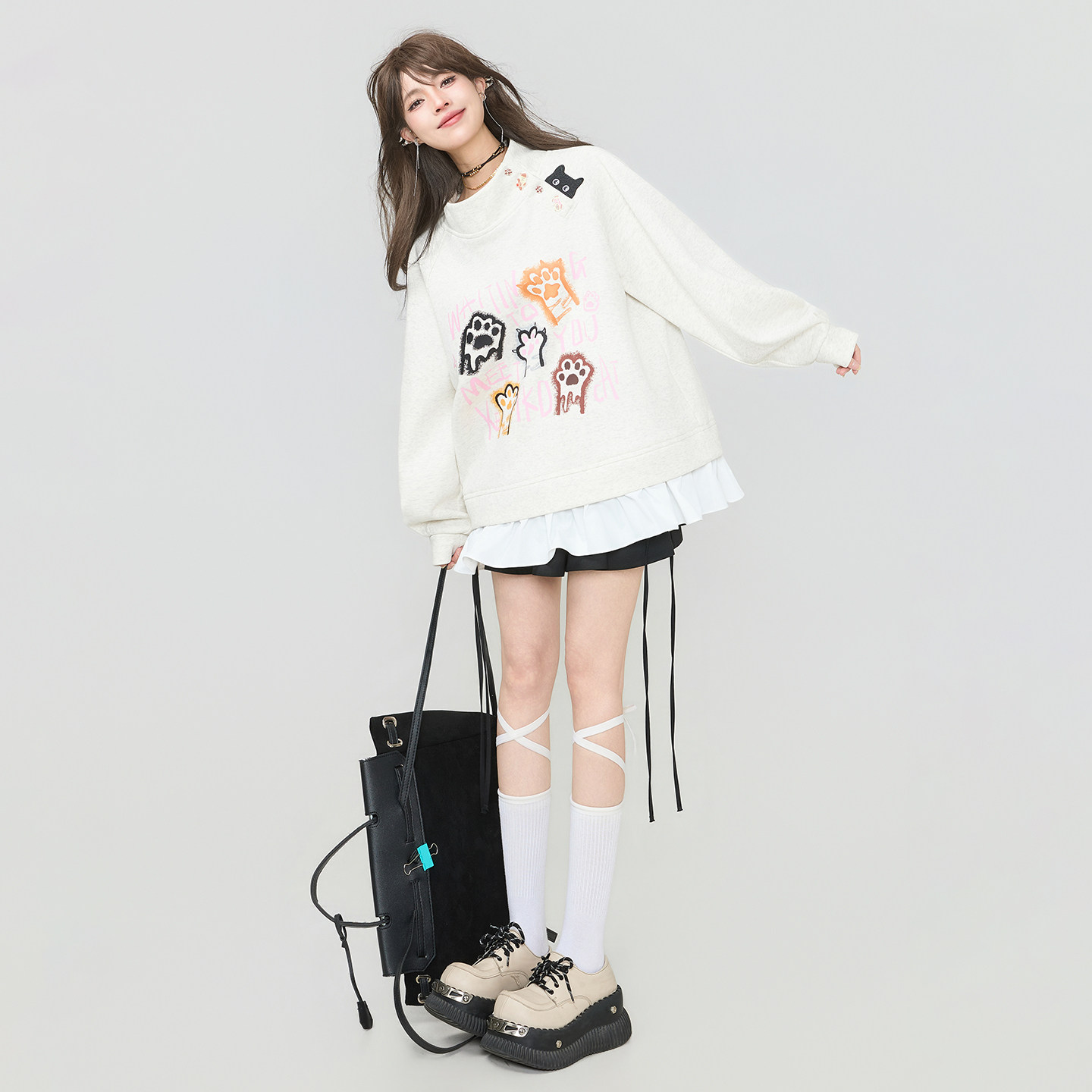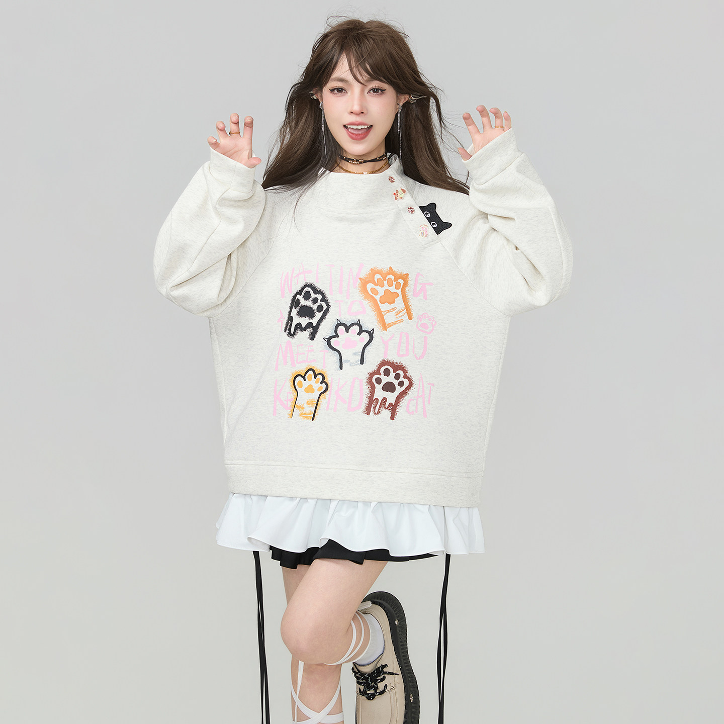 天猫KEIKO 涂鸦风猫爪印花加绒卫衣女26春季甜系花边下摆拼接立领外套