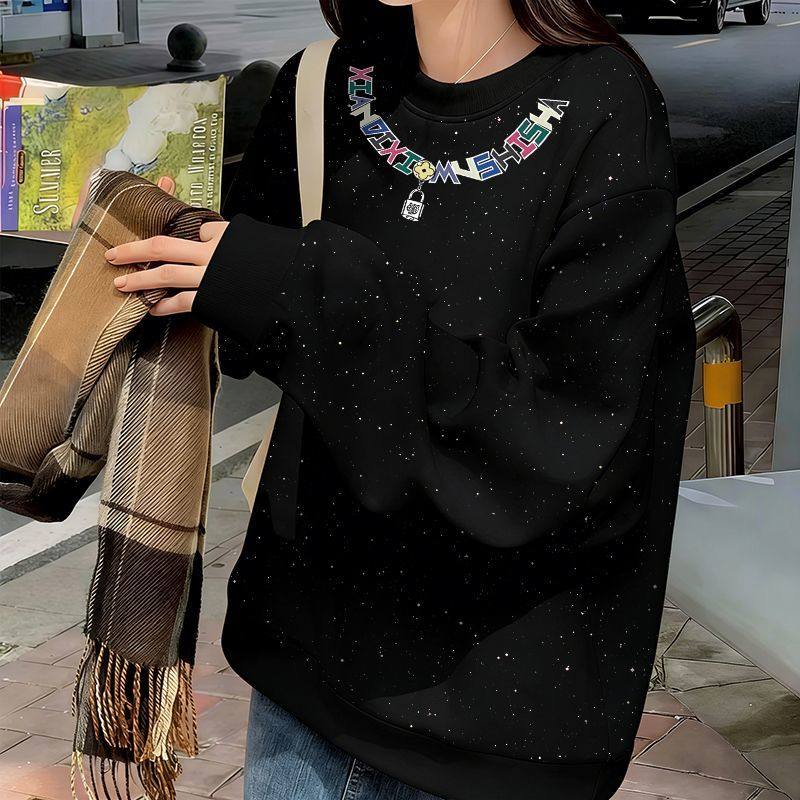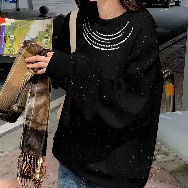 天猫秋冬季黑色小众原宿风复古圆领亮片卫衣女生时尚中长款加绒上衣服