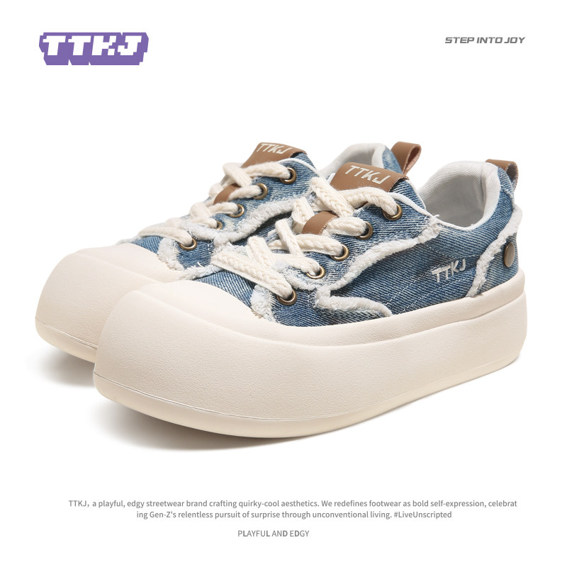 天猫TTKJ牛仔帆布鞋女2025超火鞋子小狗鞋花休闲运动大头厚底蓝色板鞋