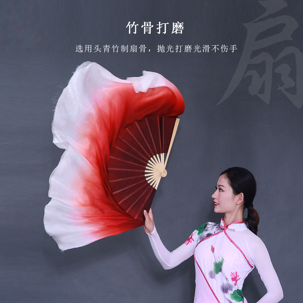 淘双面真丝古典玫红色渐变色舞蹈扇演出扇加长成人跳舞扇子秧歌扇