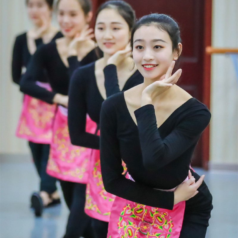 淘宝定做羌族民族风练习练功上衣腰带铃铛甩肩玲舞蹈表演出艺考级服装