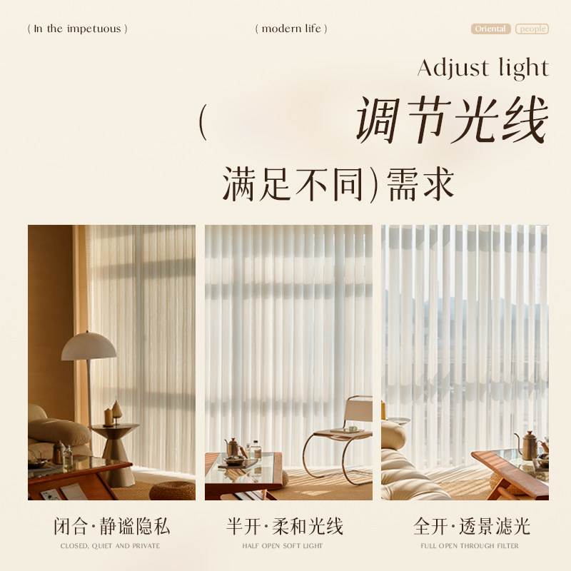 电动智能窗帘,集科技与生活美学于一体,适用于客厅、卧室、阳台等多种空间。采用梦幻帘设计,透光不透人,白天柔化阳光,营造温馨私密氛围;夜晚则提供良好遮光与遮阳效果,守护宁静睡眠。搭配智能控制系统,支持手机APP、语音操控及定时开关,轻松实现远程操作。垂直帘结构贴合落地窗设计,开合顺滑,节省空间,兼具装饰性与实用性。优质面料抗UV、防褪色,经久耐用。无论是现代简约还是轻奢风格,都能完美融入,提升家居智能化与舒适度,是现代智慧生活的理想之选。