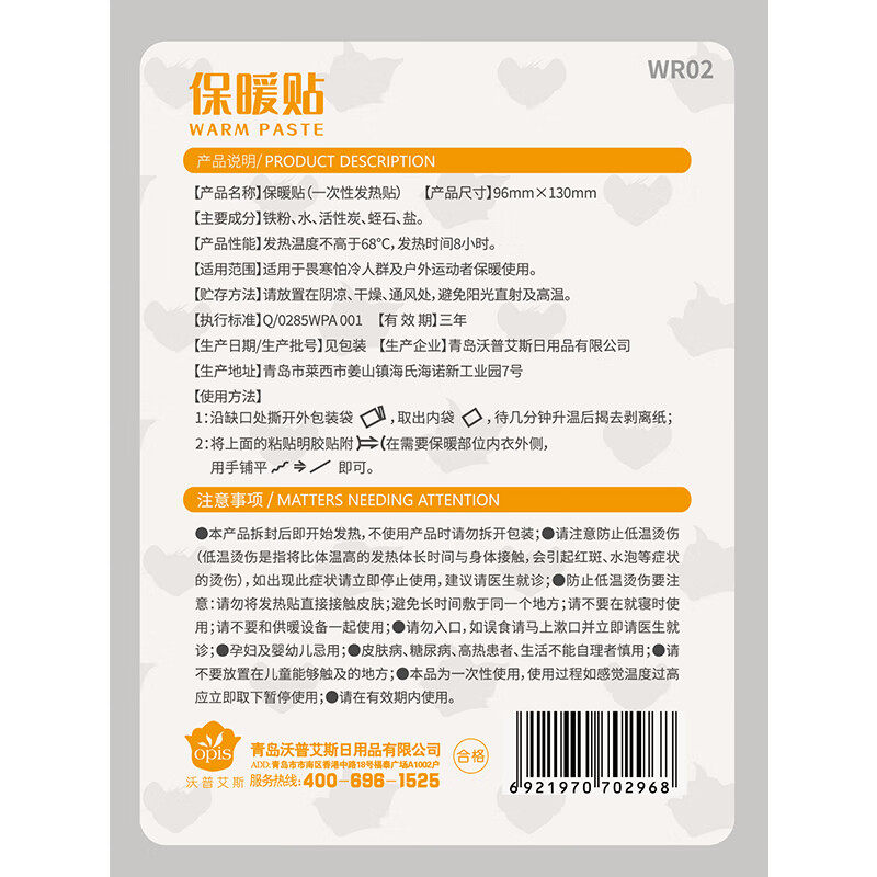 海氏海诺艾暖保暖贴是一款一次性发热暖宝宝贴,专为寒冷环境下的身体保暖设计。每包含20片独立包装,使用方便,安全环保。采用优质铁粉、活性炭、矿物盐等成分,接触空气后可持续发热12小时以上,温度稳定在40-60℃之间,温暖舒适不烫伤。适用于肩颈、腰背、腹部及关节部位,有效缓解寒冷带来的不适,特别适合冬季户外、办公久坐或生理期保暖使用。产品通过安全检测,无异味、不渗漏,贴合衣物不脱落。海氏海诺品牌专注医疗健康领域,品质值得信赖。无论是日常防寒还是运动防护,艾暖保暖贴都是您贴心的温暖伴侣。