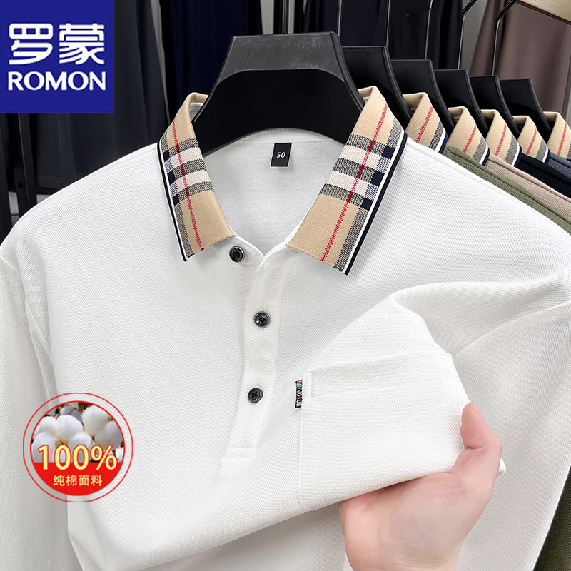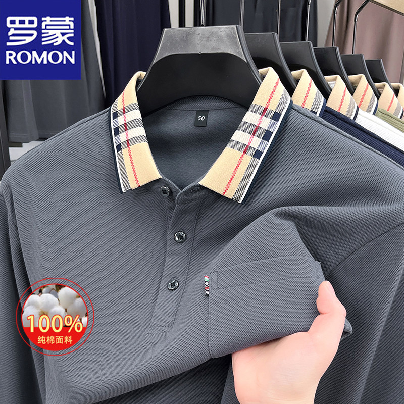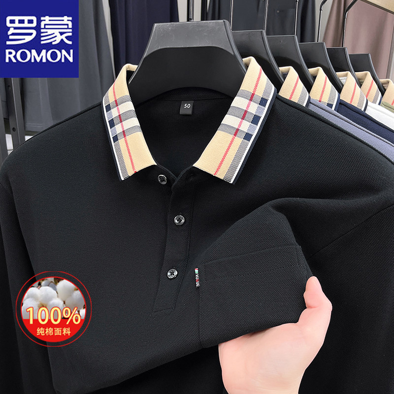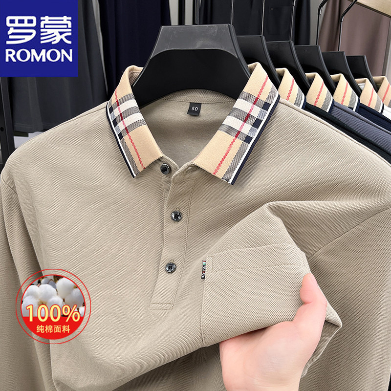 淘宝罗蒙2025春秋新款男士100%纯棉长袖Polo衫休闲格子领口袋t恤男装
