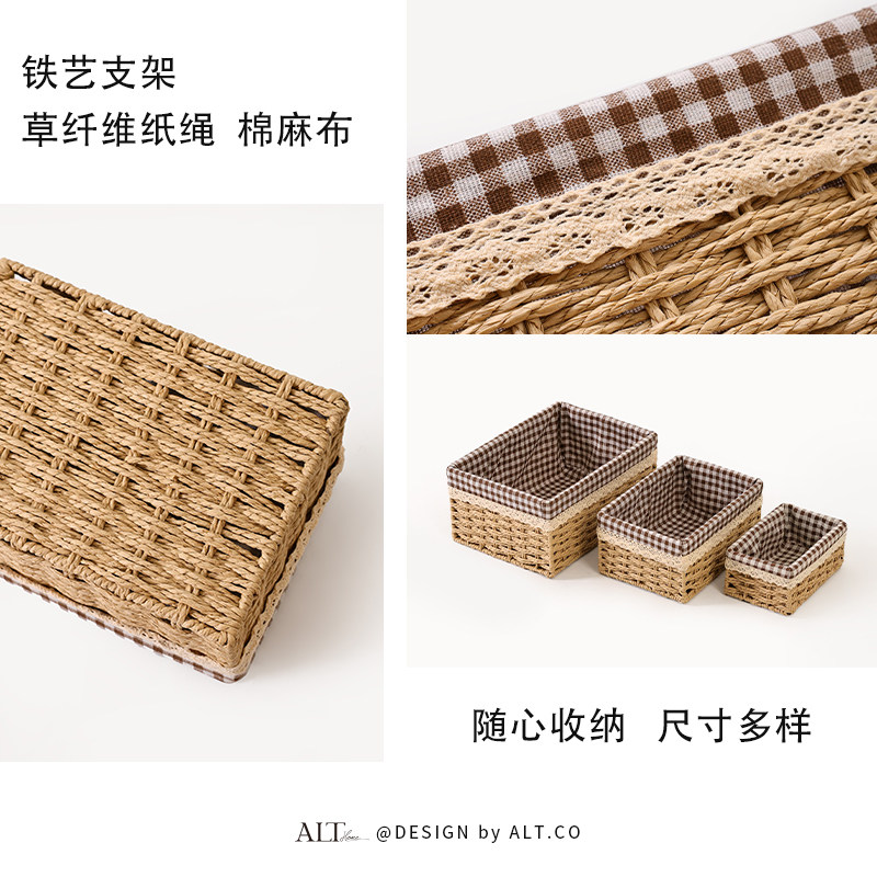 天猫手工编织桌面收纳篮家用长方形大容量杂物收纳框放钥匙纸绳收纳盒