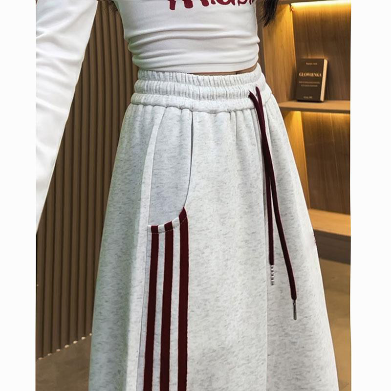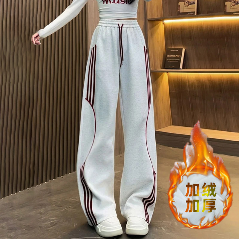 天猫秋冬季加绒加厚美式撞色条纹卫裤女垂感休闲裤宽松直筒伞兵阔腿裤