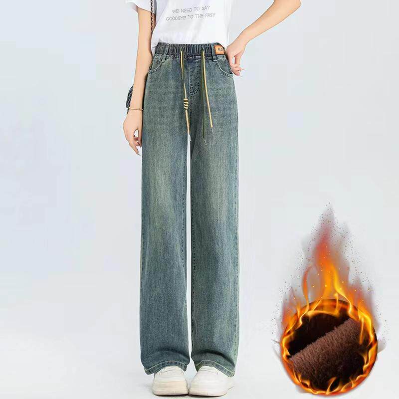 淘宝松紧腰加绒小个子牛仔裤女2025秋冬新款垂感高腰加厚加长版直筒裤