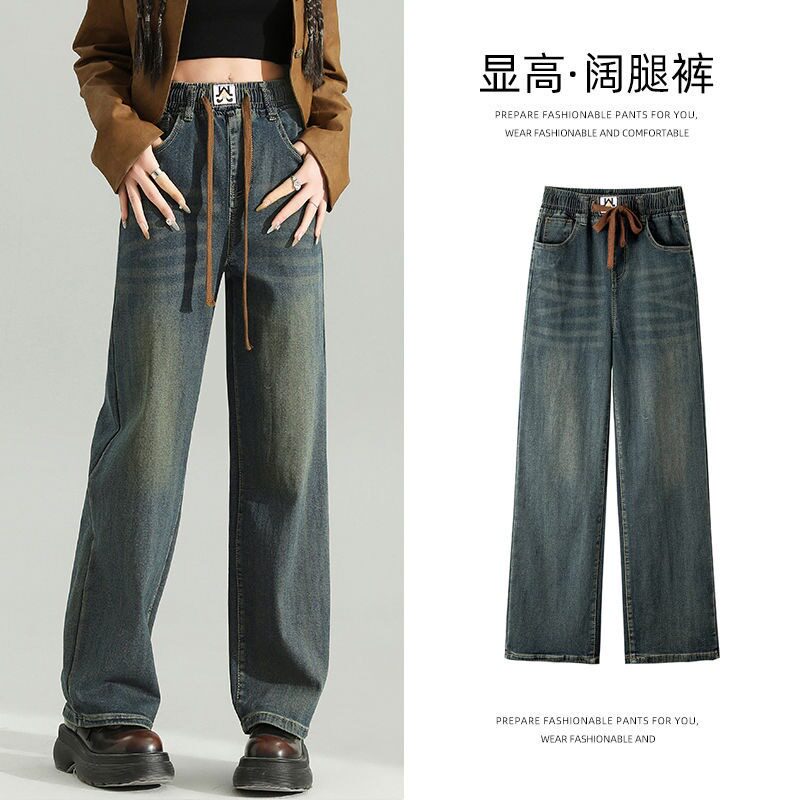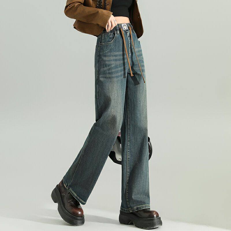 复古蓝低腰直筒牛仔裤女2026新款美式水洗设计感宽松阔腿拖地裤子