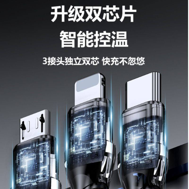 透视芯片100W快充三合一数据线,集苹果Lightning、Type-C和Micro-USB三种接口于一体,支持一拖三充电,兼容iPhone、华为、小米等主流安卓设备。内置智能透视芯片,实时显示充电功率与电压,安全可靠。支持100W超级闪充,充电速度提升显著,搭配LED呼吸指示灯,夜间使用更便捷。线身采用高强度尼龙编织材质,耐用抗拉扯,适用于居家、办公及车载多种场景。无论是手机、平板还是耳机,一根线全搞定,告别繁琐线材,真正实现高效、便携、多功能的充电体验,是现代智能生活的理想充电伴侣。