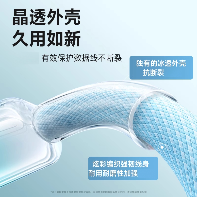 双Type-C晶透渐变编织数据线,支持240W超级快充,兼容PD/QC等多种快充协议,可为苹果iPhone 15、华为、荣耀、小米、OPPO、vivo等主流手机,以及iPad、平板、笔记本、蓝牙耳机等设备高效充电与数据传输。采用高强度尼龙编织线身,耐用抗拉扯,晶透渐变设计时尚美观,接口镀金处理防氧化。线芯加粗设计,保障大电流稳定传输,充电更快更安全。即插即用,广泛兼容,是日常出行、办公娱乐的理想充电伴侣,兼顾性能与颜值,满足多设备快充需求。