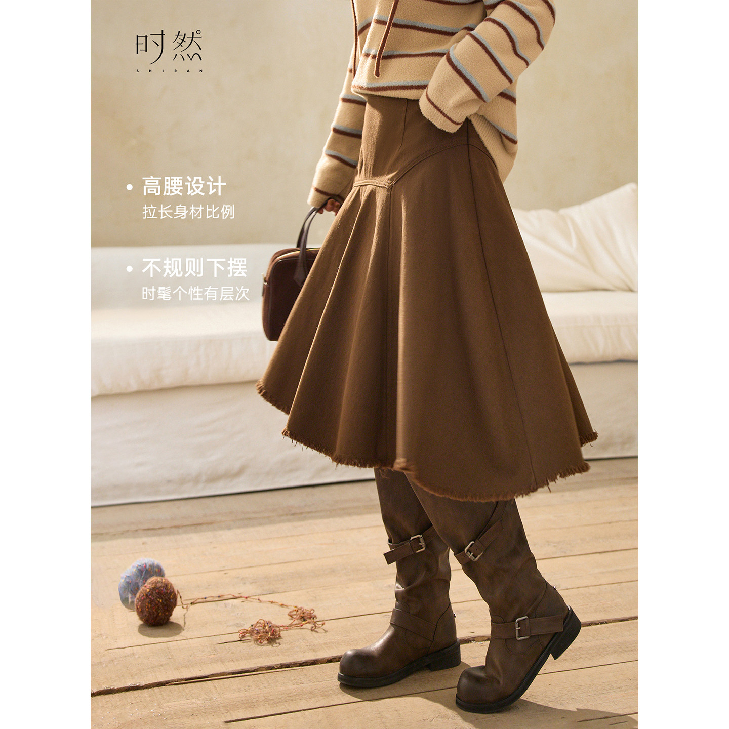 天猫时然大码女装纯棉斜边伞裙25秋冬新款微胖mm显瘦休闲不规则半身裙