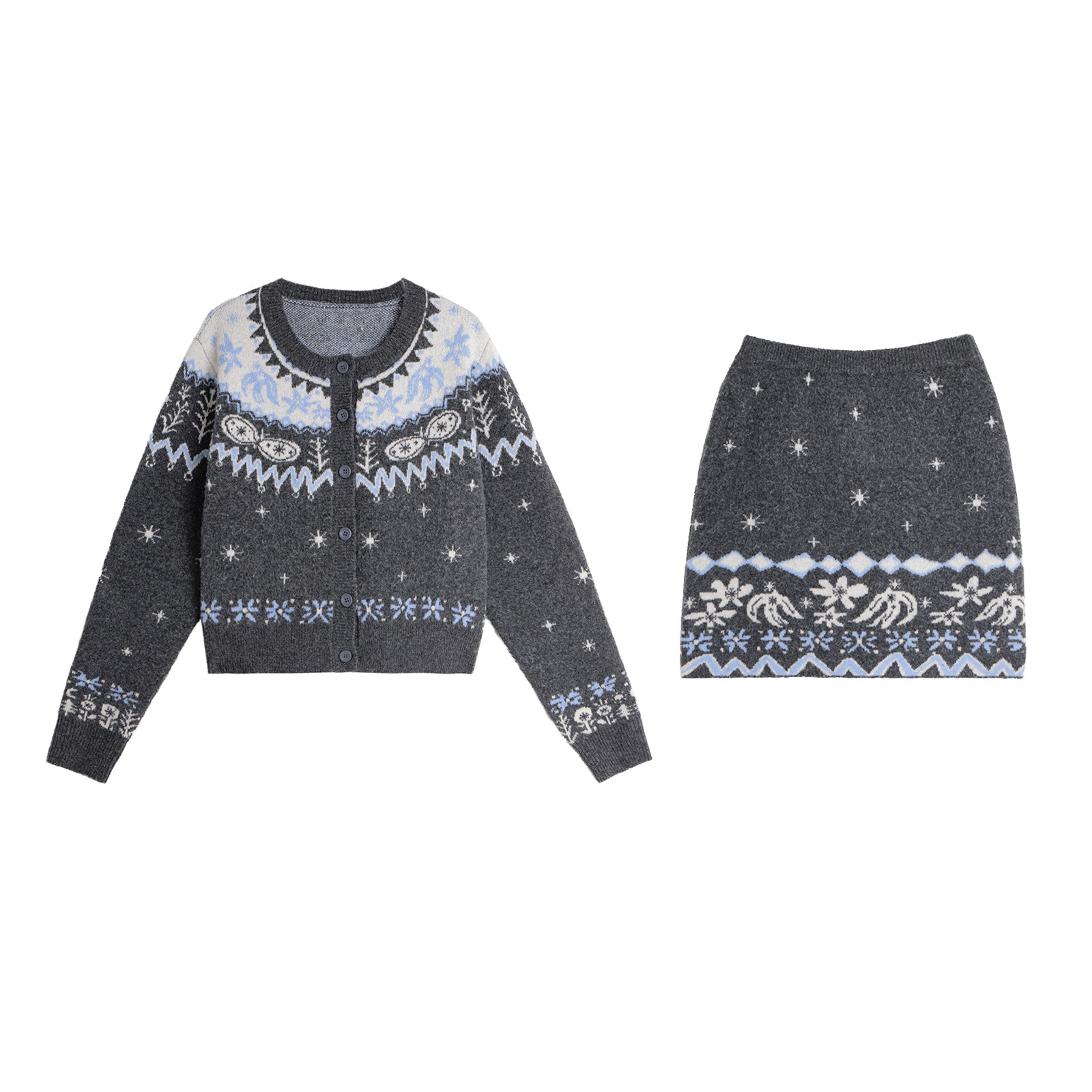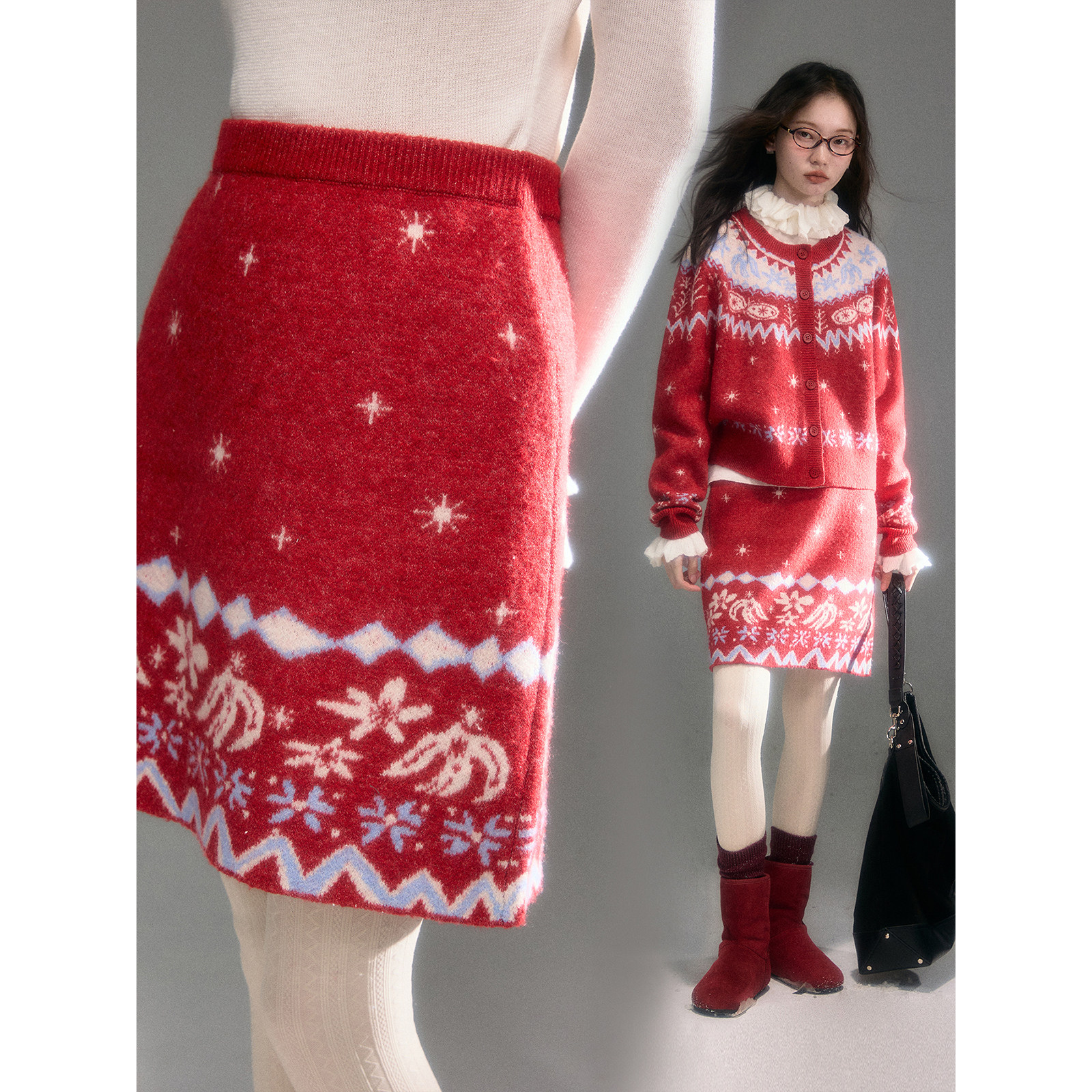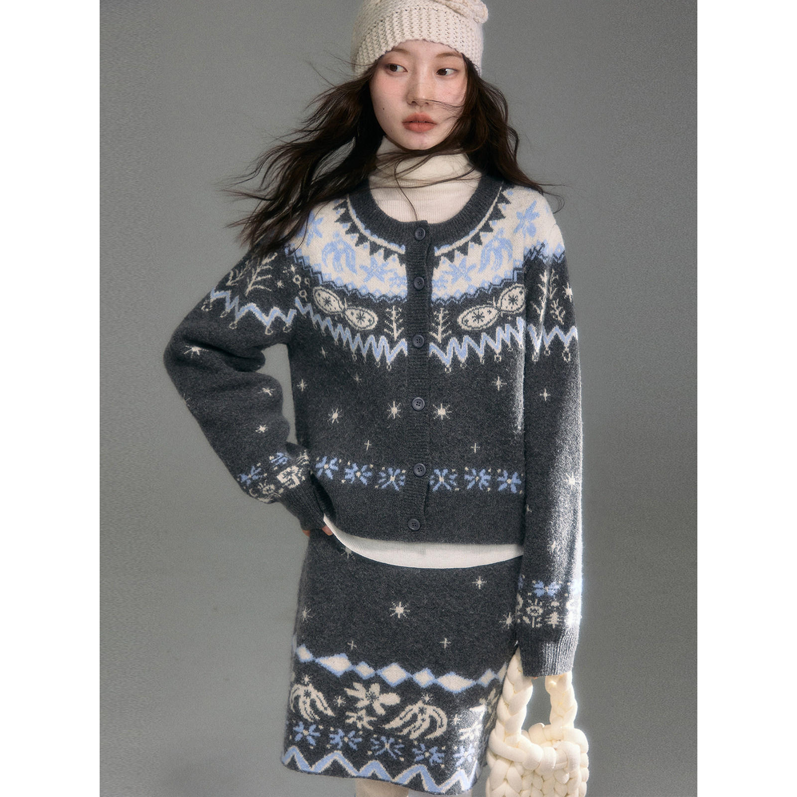 淘宝有耳uare原创设计 雪花费尔岛 节日氛围提花毛衣开衫半身裙套装