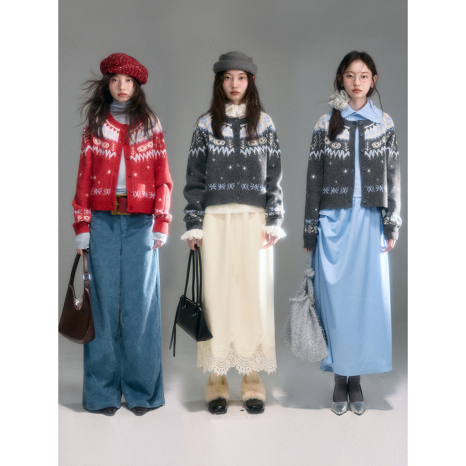 有耳uare原创设计雪花费尔岛节日氛围提花毛衣开衫半身裙套装,以经典费尔岛提花工艺融合冬日雪花、雪花杉等 festive 图案,营造出浓厚的节日温馨感。采用高品质羊毛混纺面料,柔软亲肤且保暖性佳。开衫设计宽松舒适,搭配同系列A字型半身裙,整体造型复古优雅又不失现代时尚感。精致细腻的提花织纹与柔和配色相得益彰,无论是圣诞聚会还是冬日约会都能轻松驾驭。套装可单穿亦可叠搭,实用性强,尽显女性温柔气质,是冬季衣橱中不可或缺的节日单品。