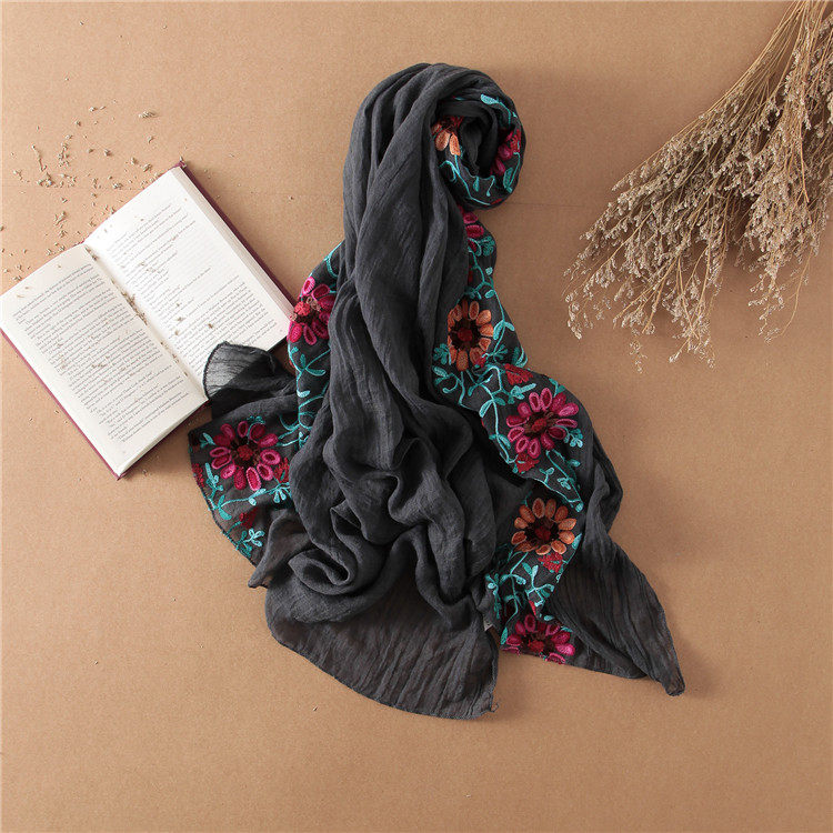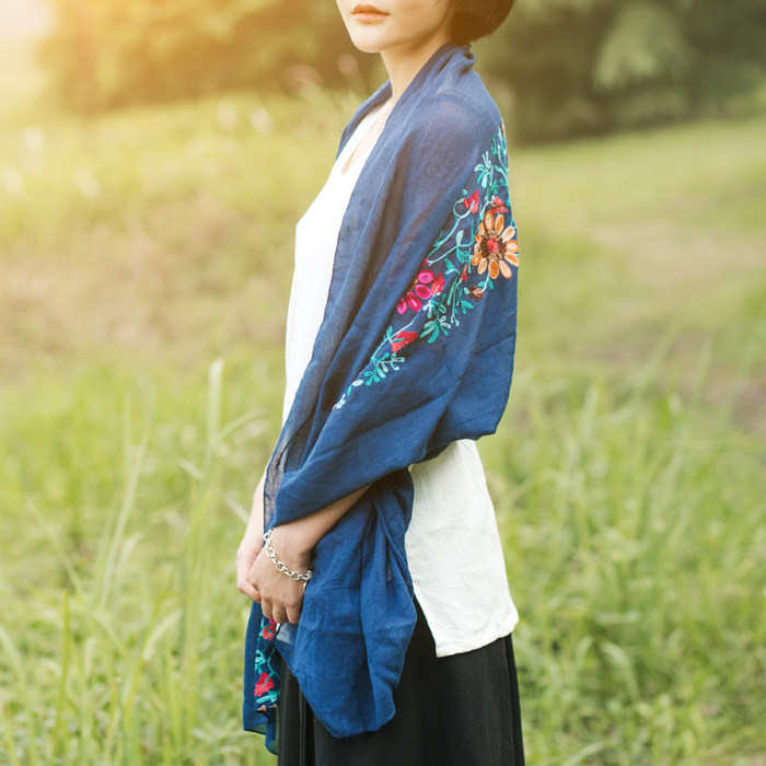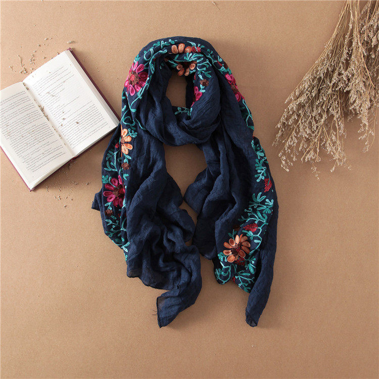 天猫秋冬新款民族风绣花棉麻手感围巾文艺旅行披肩刺绣花朵防晒长丝巾