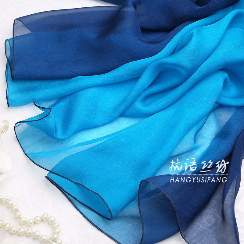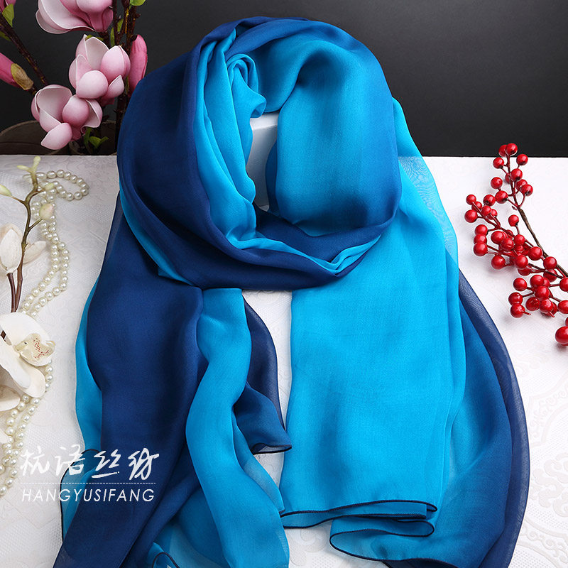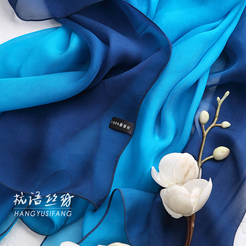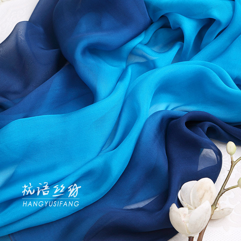 天猫蓝色手绘渐变色杭州桑蚕丝围巾女长款真丝丝巾夏春秋冬季披肩百搭