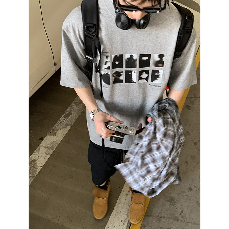 淘宝PLTH*韩系复古265g纯棉小领口宽松日常通勤经典简约百搭印花T恤男