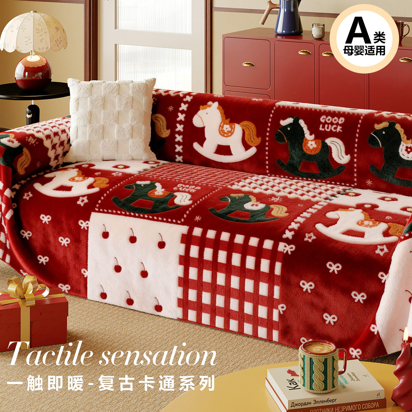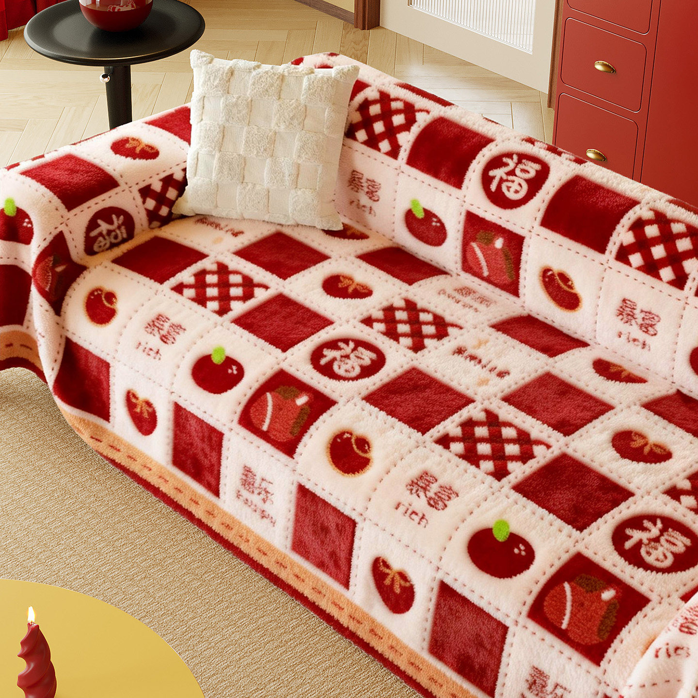 天猫2026年新款宝宝毛绒沙发垫四季通用防滑喜庆红色格子防猫抓沙发巾