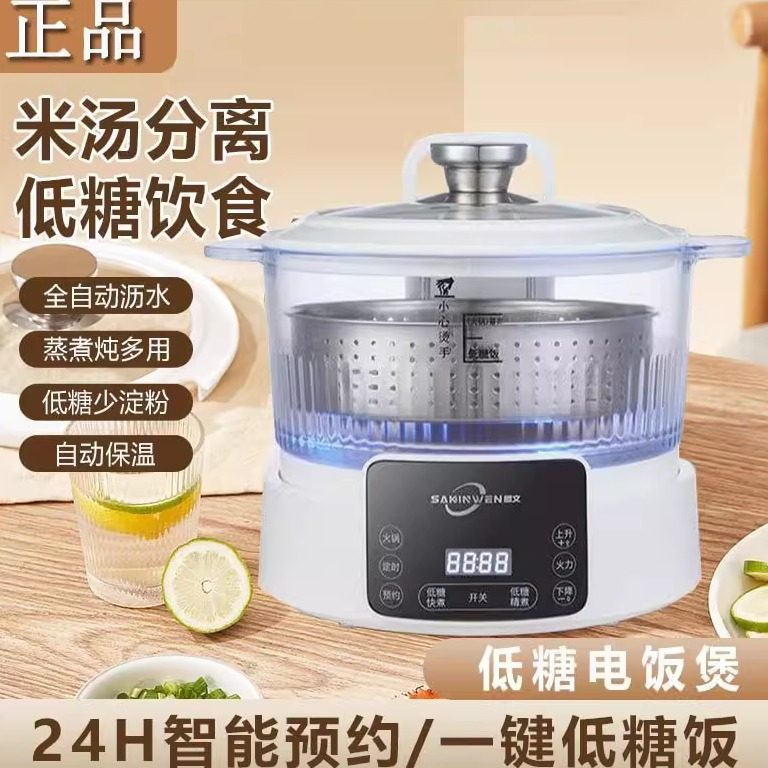 低糖电饭煲采用创新米汤分离技术,通过智能升降甑子结构,在蒸煮过程中将米汤自动分离,有效降低米饭中的还原糖和淀粉含量,实现健康控糖。其仿传统木桶蒸饭原理,使米饭粒粒分明、口感松软香甜,同时保留营养。内置智能程序精准控温,一键操作即可完成去糖蒸饭,适合糖尿病患者及减脂人群使用。沥米饭模式兼顾美味与健康,让控糖饮食更轻松。低糖电饭煲融合现代科技与古法智慧,是追求健康生活方式的理想厨房助手,开启低糖饮食新体验。