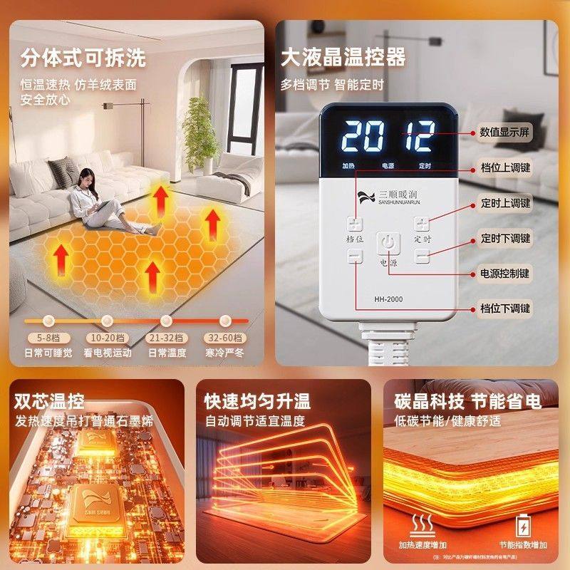 三顺暖润地暖垫是一款集取暖、舒适与安全于一体的家用电热地垫,采用先进的石墨烯加热技术,升温迅速、发热均匀,节能环保。专为客厅、儿童房等家庭场景设计,表面柔软亲肤,适合宝宝爬行、玩耍,也可作为成人日常坐卧取暖使用。垫体可折叠、易收纳,支持多档调温与定时功能,使用更安心。外层采用可拆洗设计,清洁方便,保持卫生。内置过热保护与防水层,安全可靠。无论是冬日取暖还是亲子互动,三顺暖润地暖垫都能为您带来温暖舒适的居家体验,是现代家庭的贴心之选。