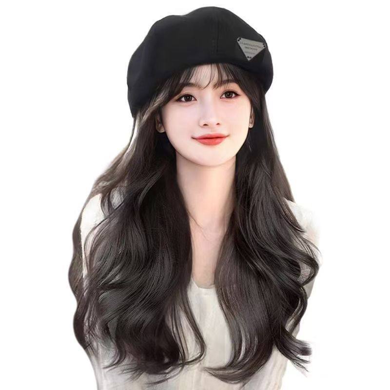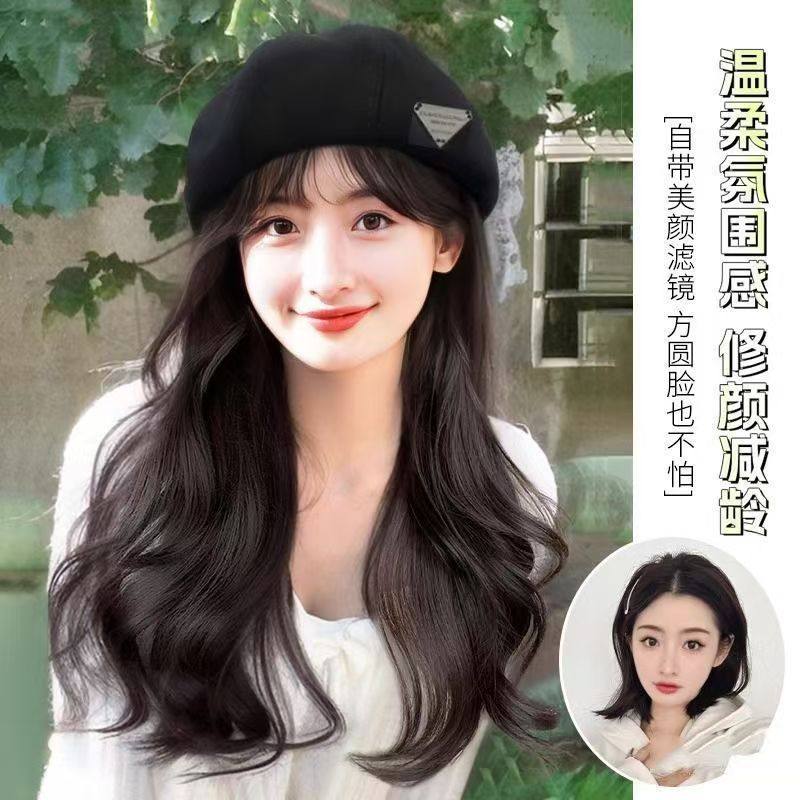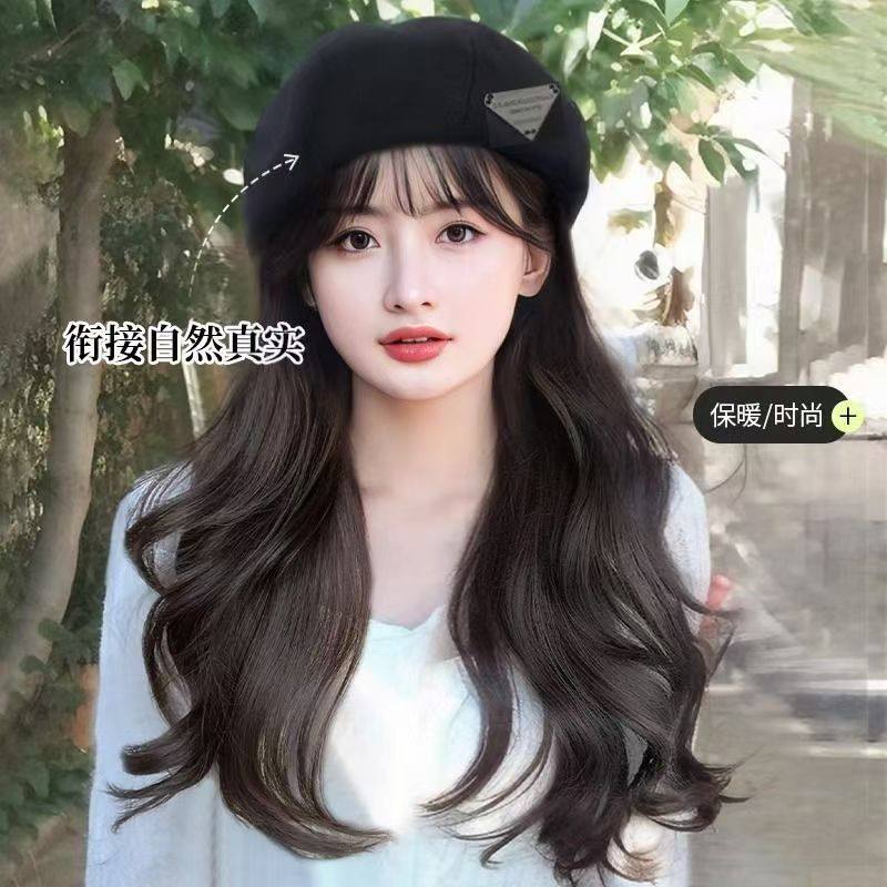 淘宝新款秋冬洋气贝雷帽假发全头套长卷发大波浪款一体式帽子假发旅行