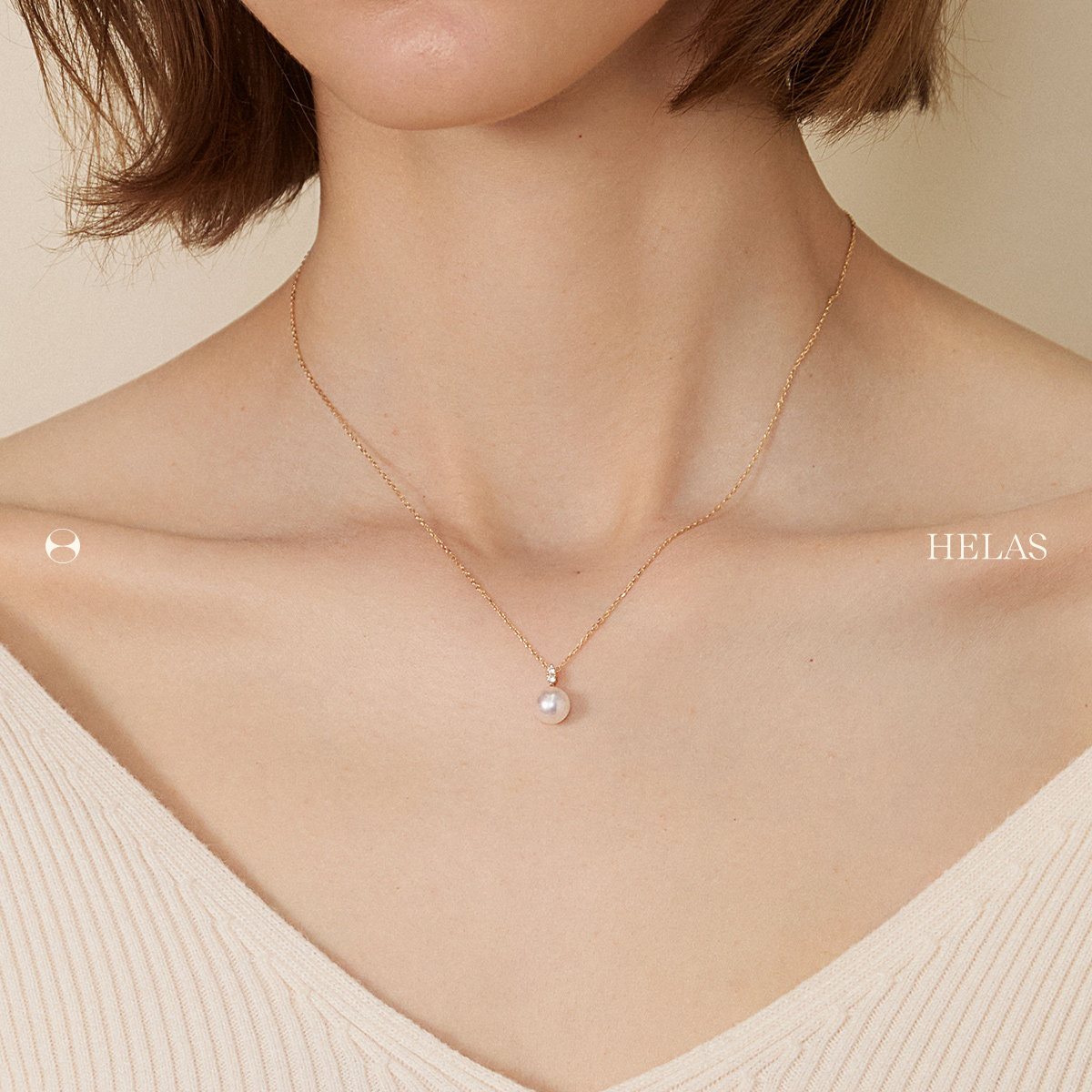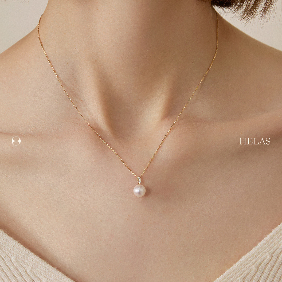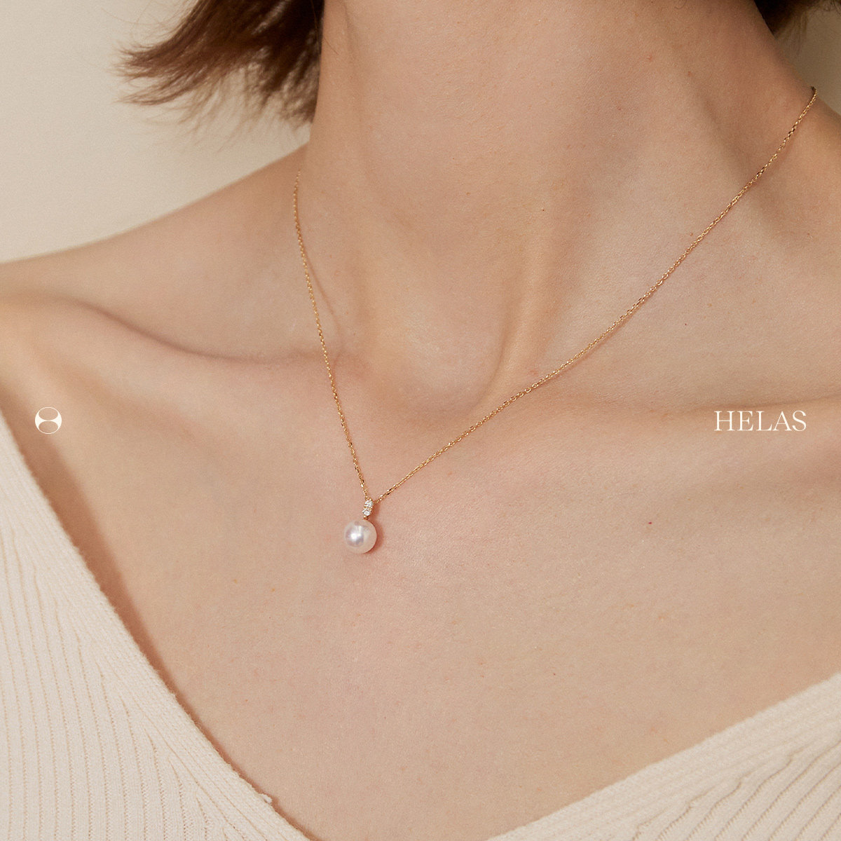 HELAS赫拉原点海水Akoya珍珠项链,精选日本海域优质Akoya珍珠,直径约7.5-8mm,光泽莹润如月光流转,表面细腻无瑕,展现极致优雅。搭配18K金镶嵌工艺,简约吊坠设计点缀璀璨钻石,提升整体奢华质感。链条柔韧贴合颈部曲线,佩戴舒适,适合日常搭配或重要场合佩戴。每一颗珍珠均经严格筛选,确保品质与美感并存。HELAS赫拉以匠心工艺融合自然之美,赋予女性温柔而坚定的气质,是馈赠挚爱或自我犒赏的珍贵之选,诠释经典与现代的完美平衡。