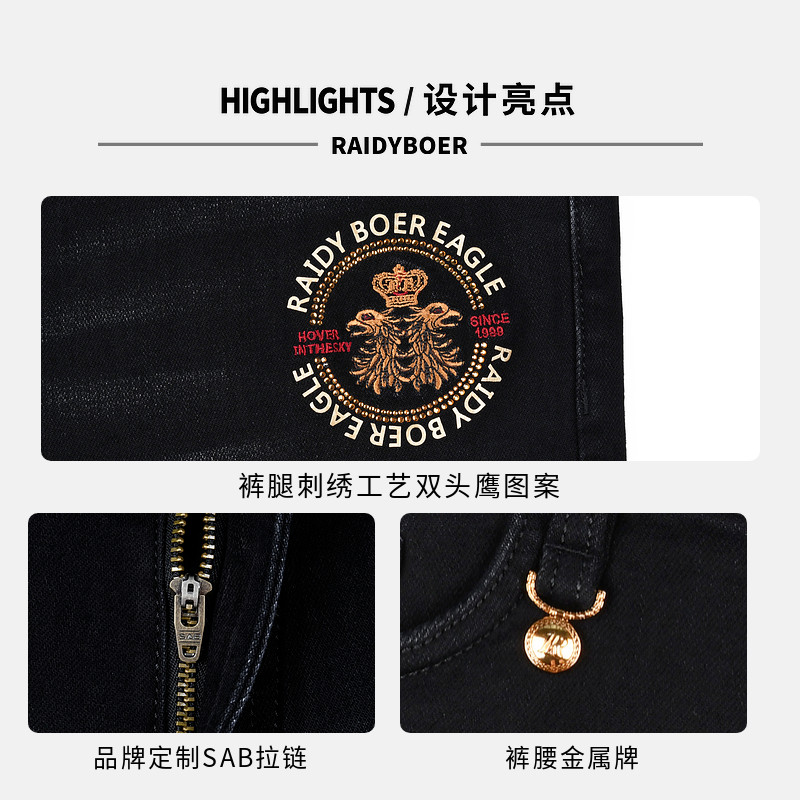 RaidyBoer雷迪波尔男士刺绣字母双头鹰牛仔裤6023-70,采用磨毛加厚工艺,触感柔软,保暖性佳,适合秋冬季节穿着。精选优质棉质面料,兼具舒适性与耐磨性,久穿不易变形。裤身以精致刺绣工艺呈现双头鹰图案,搭配字母元素,彰显品牌辨识度与个性潮流。立体剪裁设计贴合腿型,穿着自在不束缚。经典直筒版型百搭易穿,轻松驾驭休闲与轻商务风格。细节做工考究,车线工整,彰显品质感。无论是日常出行还是朋友聚会,这款牛仔裤都能助你展现型男魅力,是追求品质与时尚的男士理想之选。